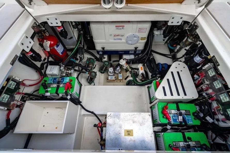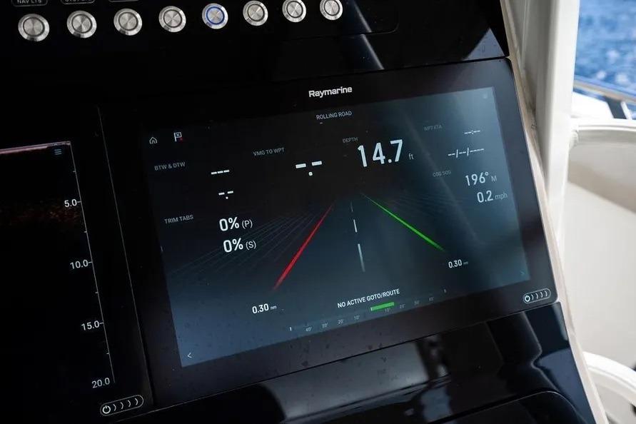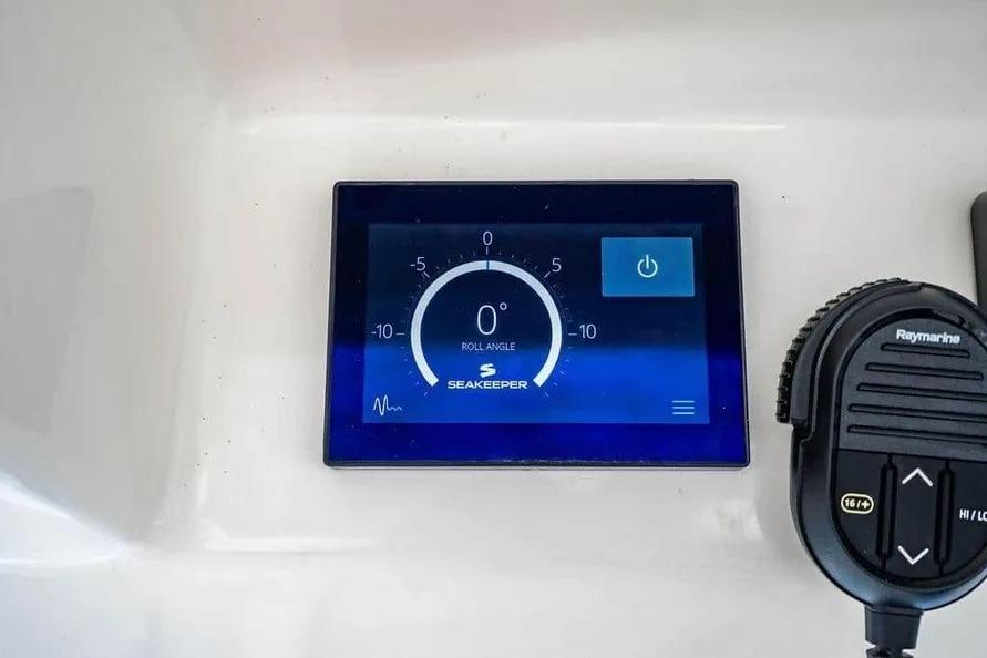 Electronics Upgraded glass-bridge helm displays · 55″ open-array radar · spotlight · LED lighting · Seakeeper 6 gyro (~180 hrs)