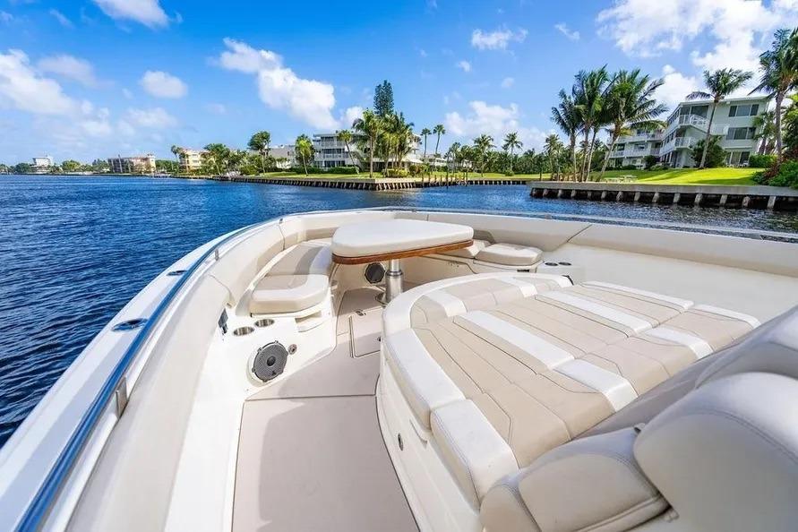 All additional info LOA 42.5 ft · Beam 13 ft · Bridge clearance 12.42 ft · Fuel 700 gal · Fresh water 60 gal · Holding 20 gal · one-owner, lightly used · recent inspection at MarineMax Pompano Beach · Dynamic Running Surface (auto tabs) · SeaDek