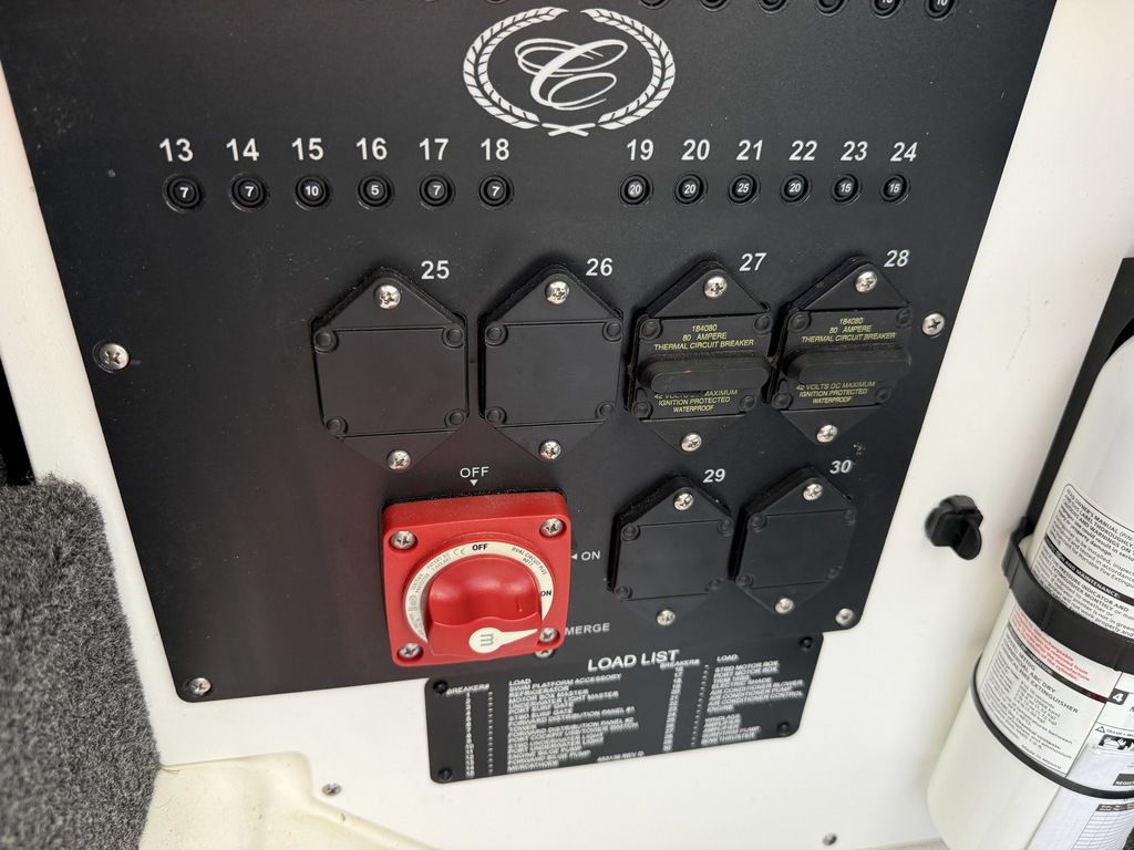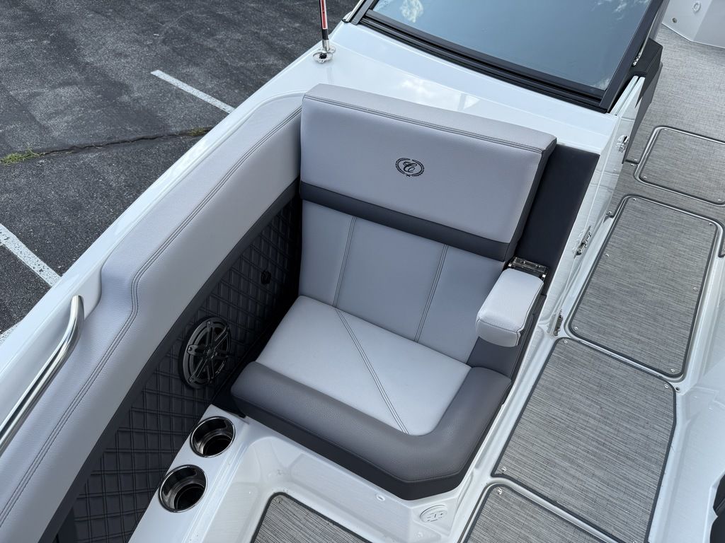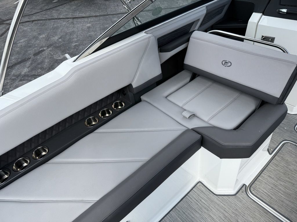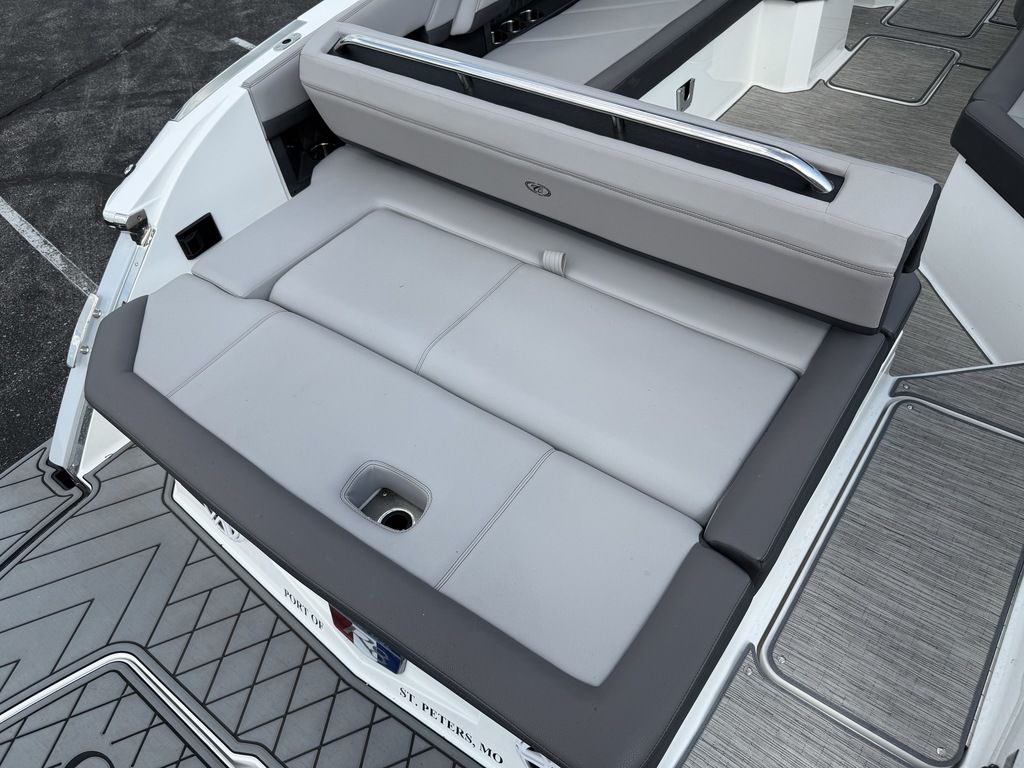 Full Mooring Cover, Premum Bimini Top, Bow Sail Shade, Sea Grass Flooring, SeaDek Swim Platform Mat, Flip-Down Swim Step, 10" Garmin Screens (2), Flag Poles (2), Bow Filler Cushions, Transom Radio Remote, Premium Sound Package w/transom Speakers and Subwoofer, Stainless Docking Lights, Dual Battery System w/Switch, Fiberglass/teak Dinette Table, Electric Adjustable Helm Seat, LED RGB Interior Lighting, Trim Tabs and In-Floor Storage Lockers (4). Trailer Not Included