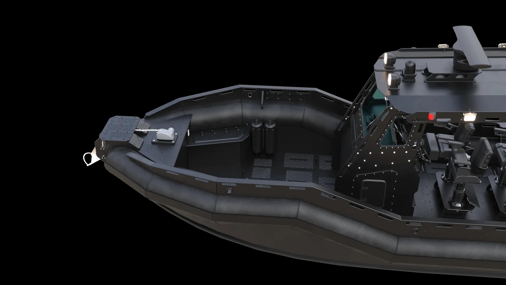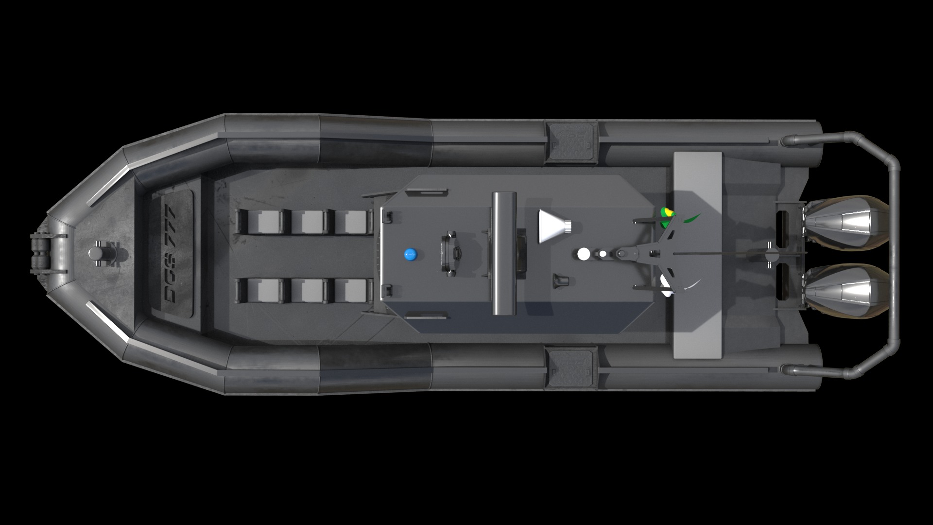 Constructed with an impact-mitigating EHTB hull, anti-fatigue deck, and military-grade SHOX seating, the DGS 777 dominates chop with comfort. Its cutting-edge Garmin and Raymarine electronics suite (including FLIR thermal night vision and dual 12” AXIOM Pro screens) provides full-spectrum situational awareness.