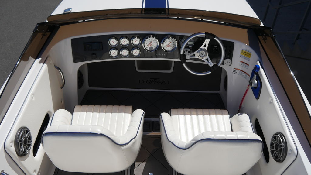 A certain head-turner, the stunning new 22' Classic 55th Anniversary Limited Edition includes newly upgraded upholstery along with a next-generation dash complete with Livorsi shifters and engine controls, upgraded gauges and a Venturi windshield. A high-performance Isotta steering wheel feels good to the touch. Custom Plasdeck cockpit flooring is accented with a custom Donzi inlay.