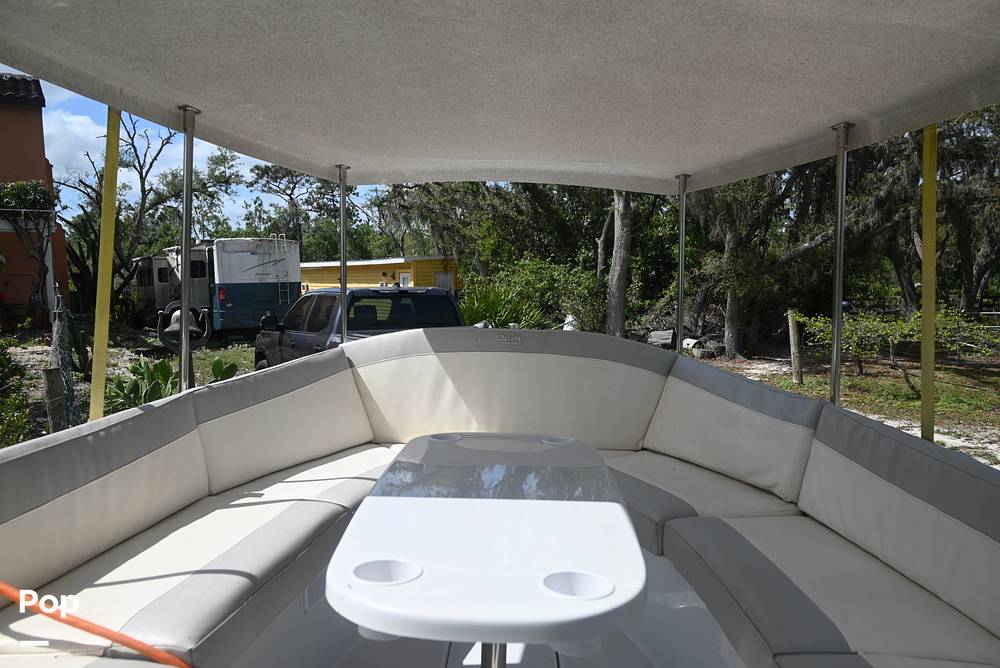 There is a large removable table for entertaining. At the helm you will find a stainless steel steering wheel, dash panel with energy gauge, charger indicator, USB ports, electric horn, phone holder and a Fusion Bluetooth stereo. Custom canvas full mooring cover included.