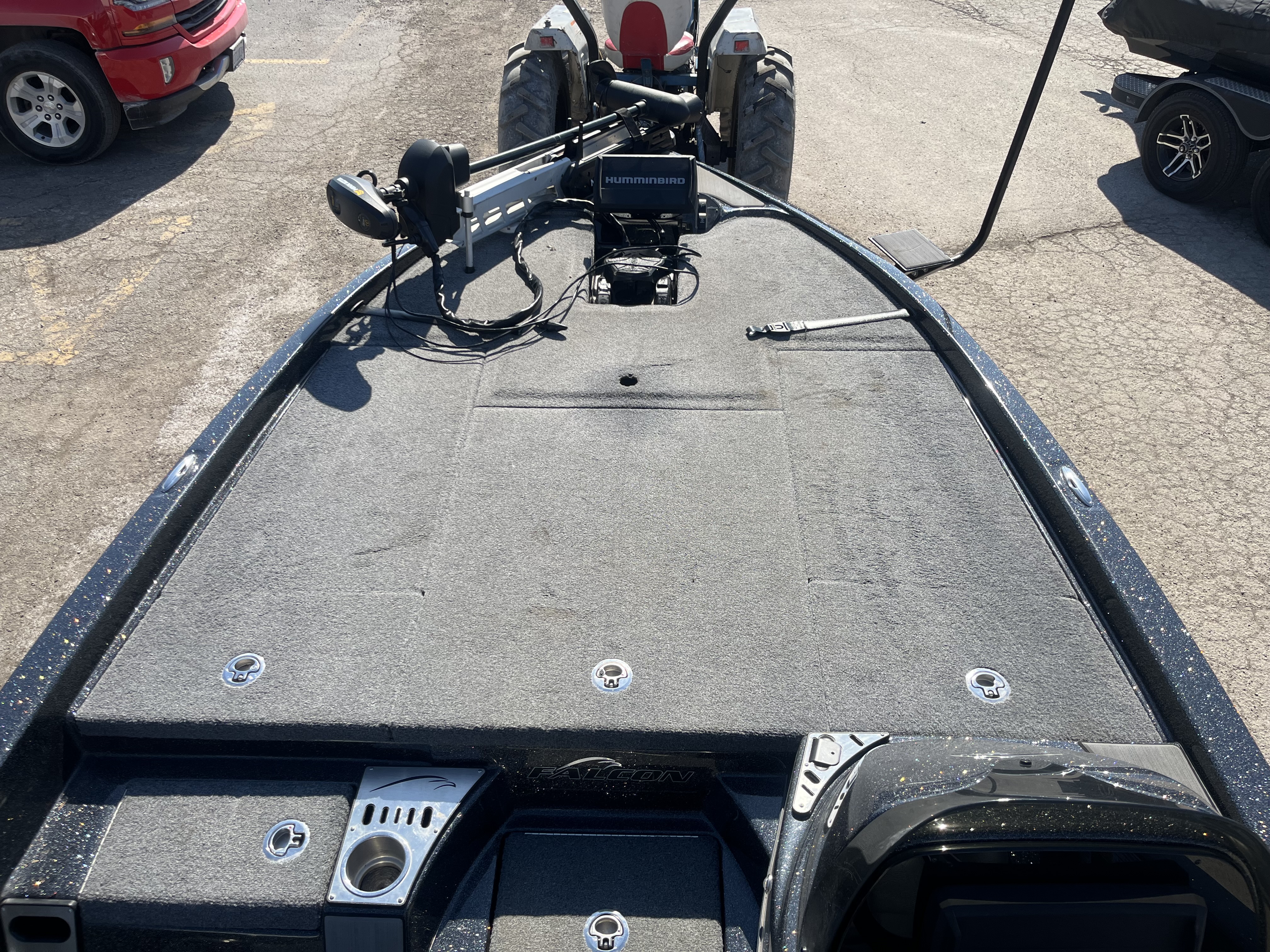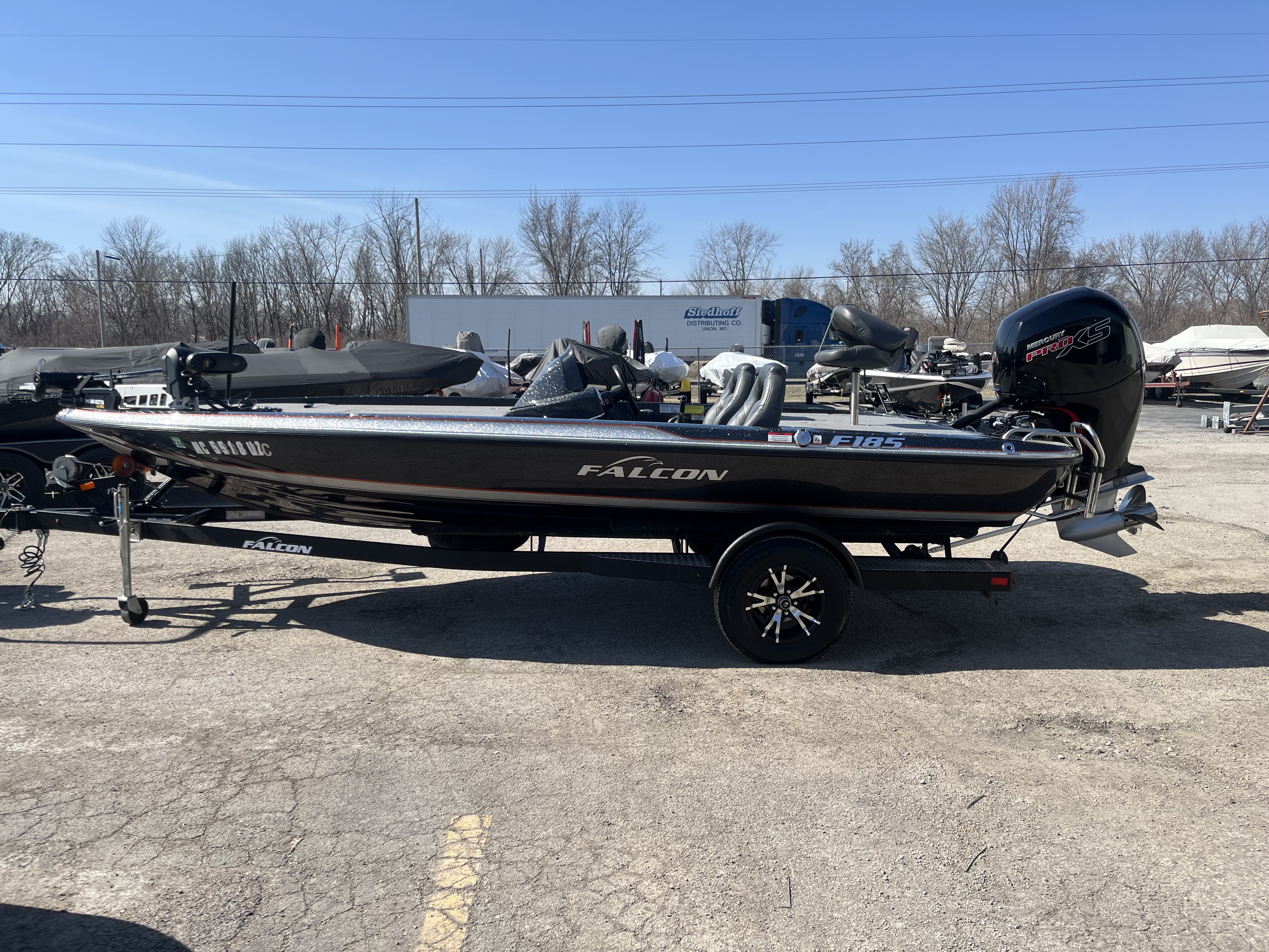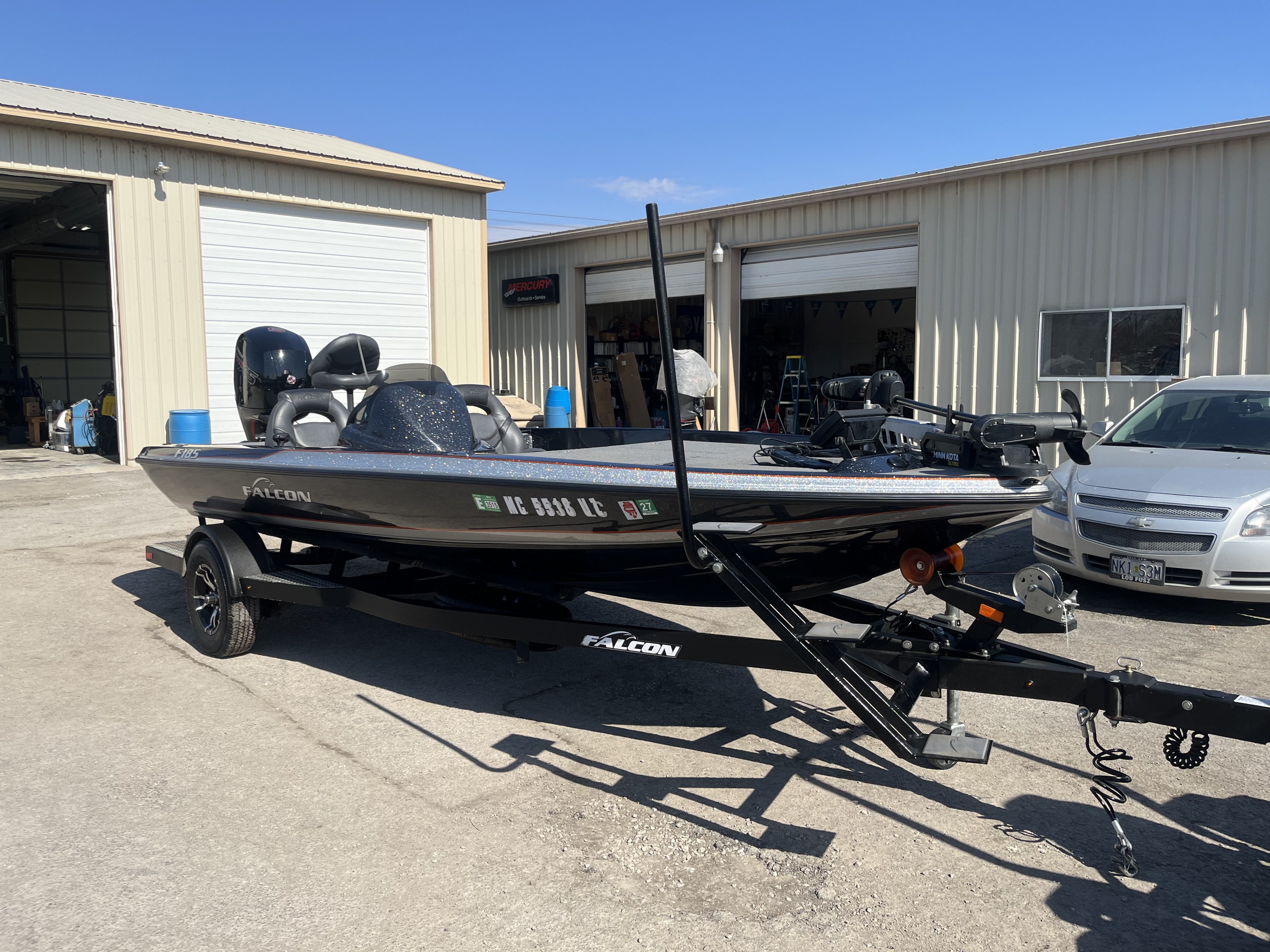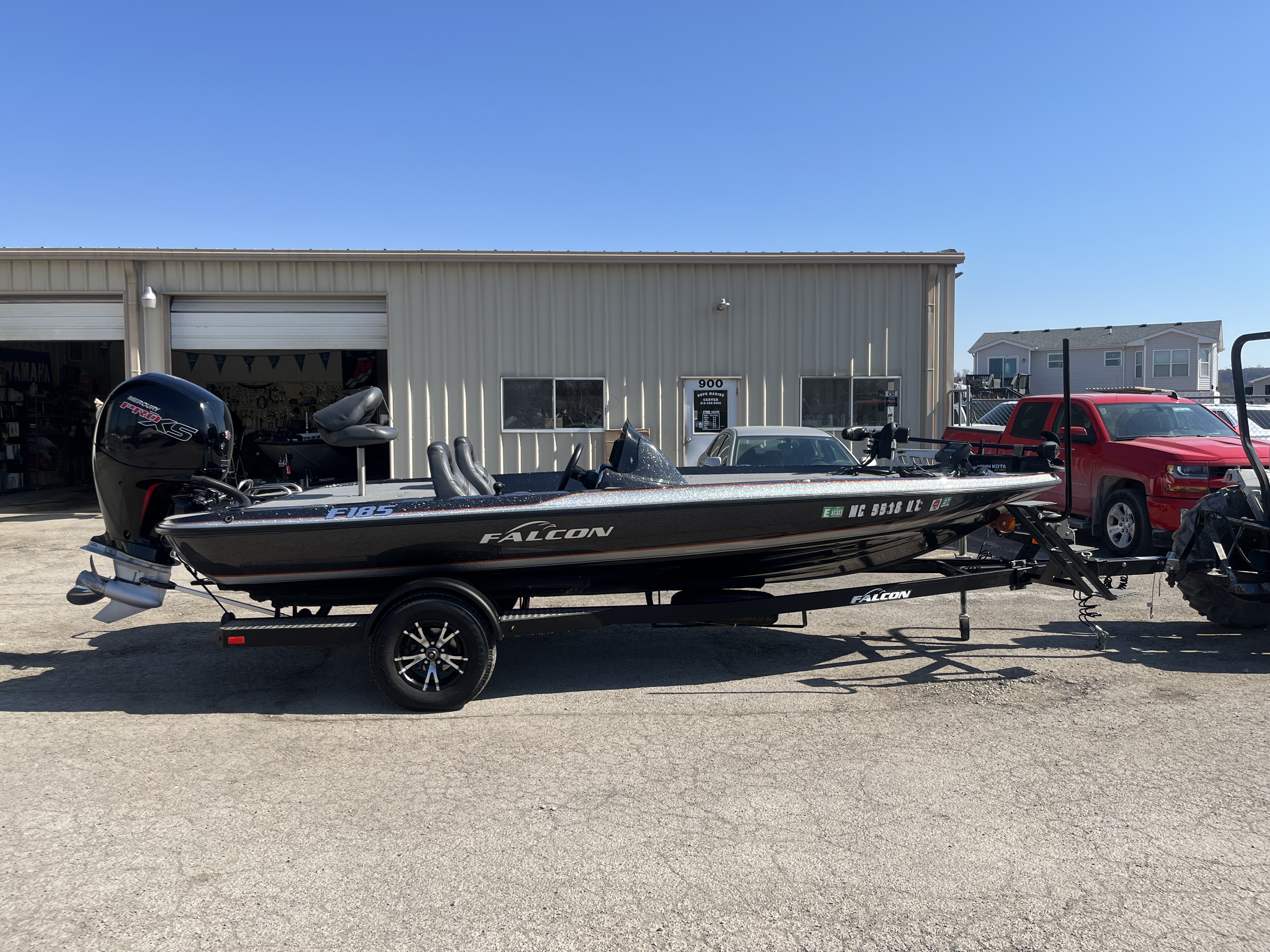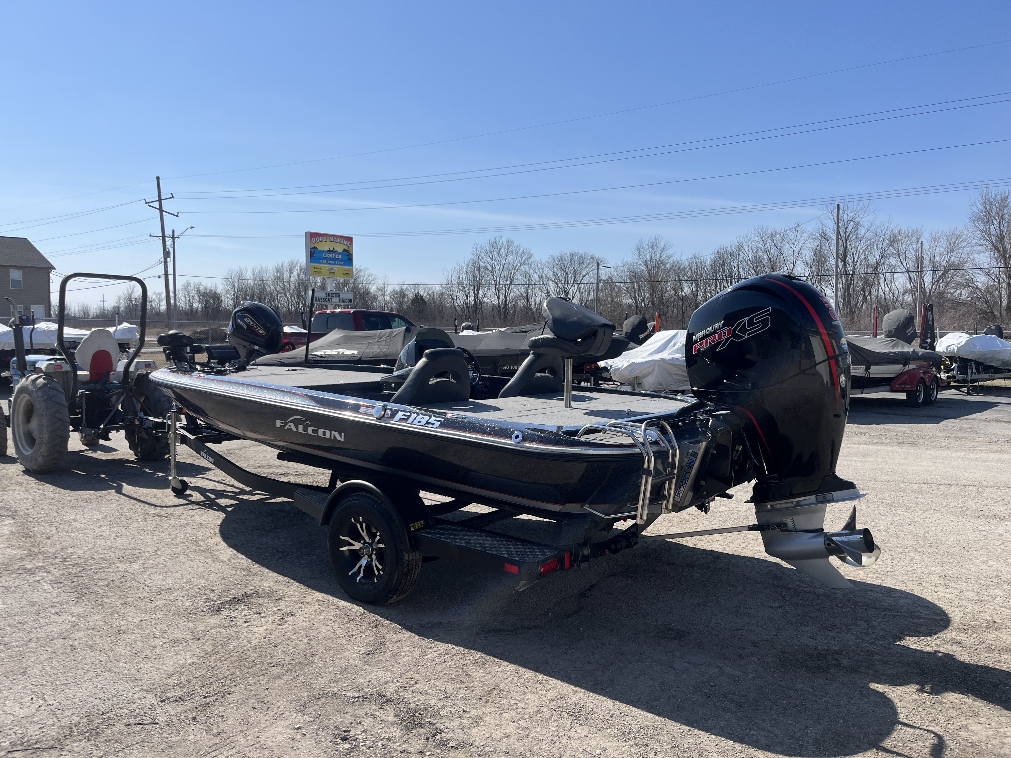 2022 Falcon F185, powered by a Mercury 150hp ProXS 4S, Minnkota Ultrex trolling motor, Humminbird Helix 9 at bow, Humminbird Helix 9 at console, single console, boarding ladder, hot foot, pro trim, boarding ladder on trailer, single axle trailer. Cover