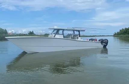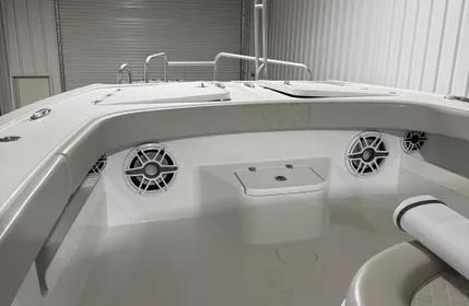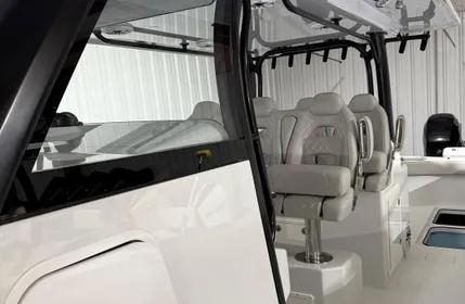 Center-console layout · expansive deck space for fishing or lounging · built-in storage compartments · plush quilted leather seating · full ceramic coating package · Ameratrail gooseneck trailer included