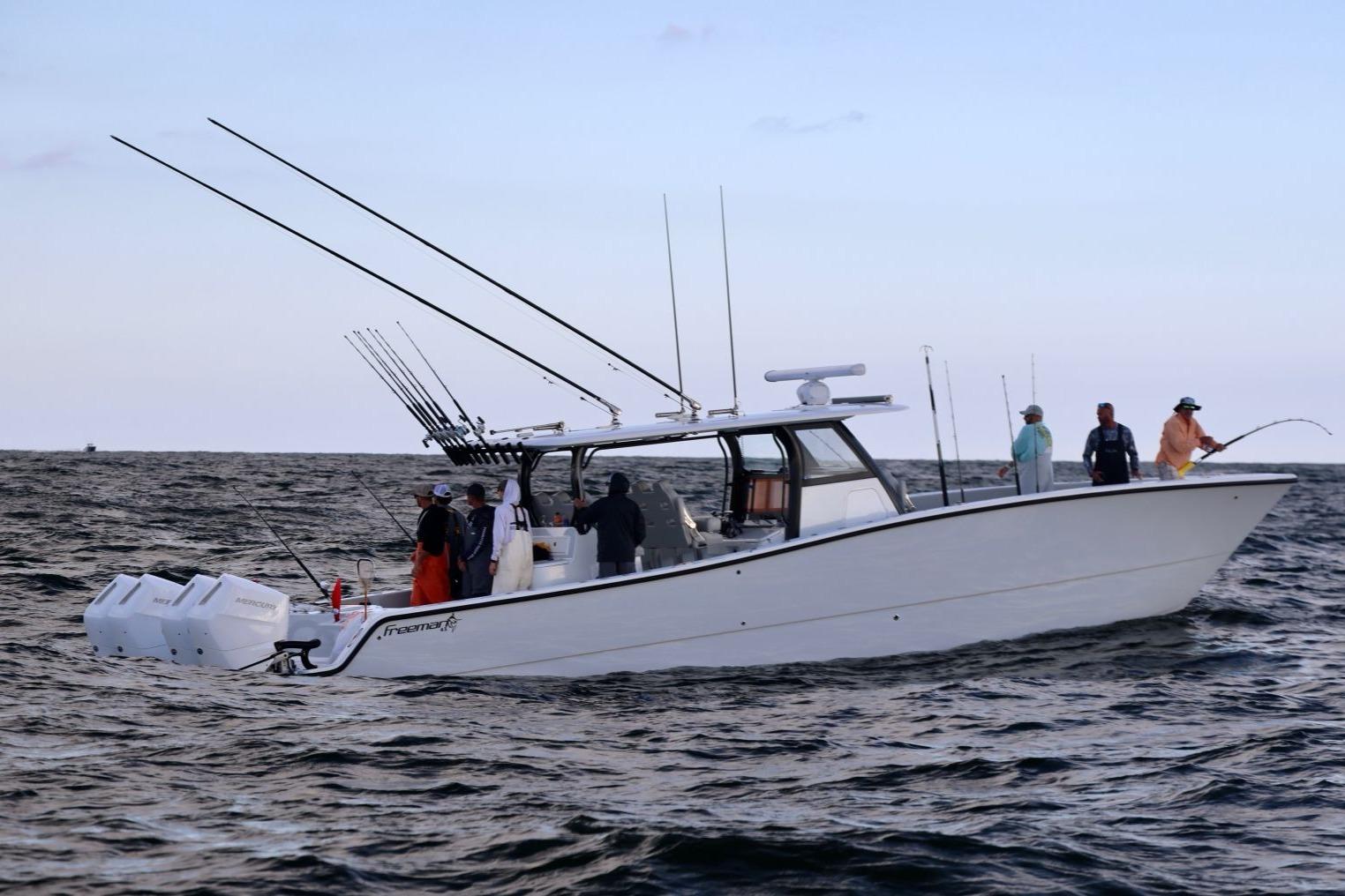 Freeman’s 43 marries long-range pace with a wide, open working deck. The 24″ Simrad helm and dual 1 kW/3 kW transducer setup give you deep, detailed returns when you’re hunting edges or bottom contour, while the center-console layout and generous storage keep the cockpit clean and efficient.