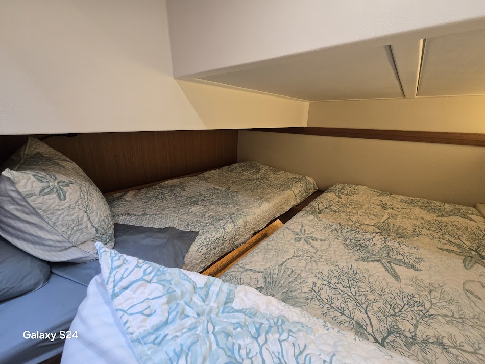 Entertainment has been thoughtfully incorporated throughout the vessel, with premium audio systems and multimedia options allowing you to enjoy music, movies, or interactive experiences indoors and outdoors. The saloon houses a wall-mounted 24” television, perfect for unwinding after a day of adventure, while the sound system ensures quality acoustics throughout the boat.