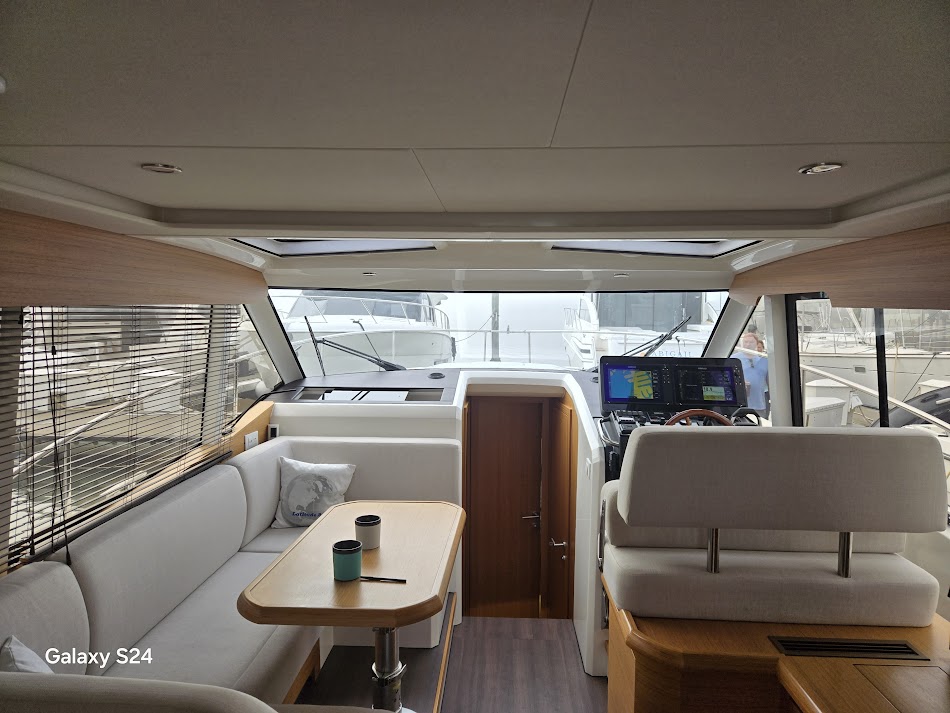 The interior boasts natural light and 360° panoramic views, complemented by Venetian wooden blinds in the saloon and pleated sun shades in the cabins for added privacy. A manually lowerable dining table in the salon, combined with an infill cushion, creates additional sleeping space when needed. Mirrors on each cabin door and Sand microfiber fabric upholstery enhance the luxurious feel. The interior woodwork in gold teak adds a touch of elegance.