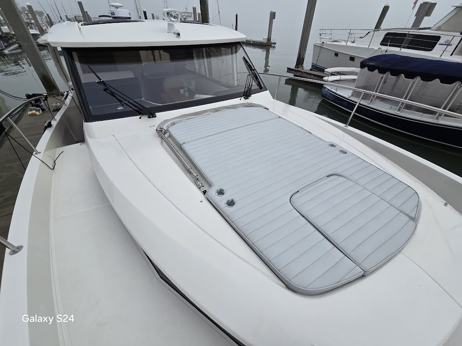 Designed for outdoor living, the galley window lifts, and the bar top extends to connect indoor and outdoor spaces seamlessly. At the bow, you’ll find a sun mattress with cup holders and a lifting headrest shaded by a Bimini cover for a comfortable sunbathing experience.