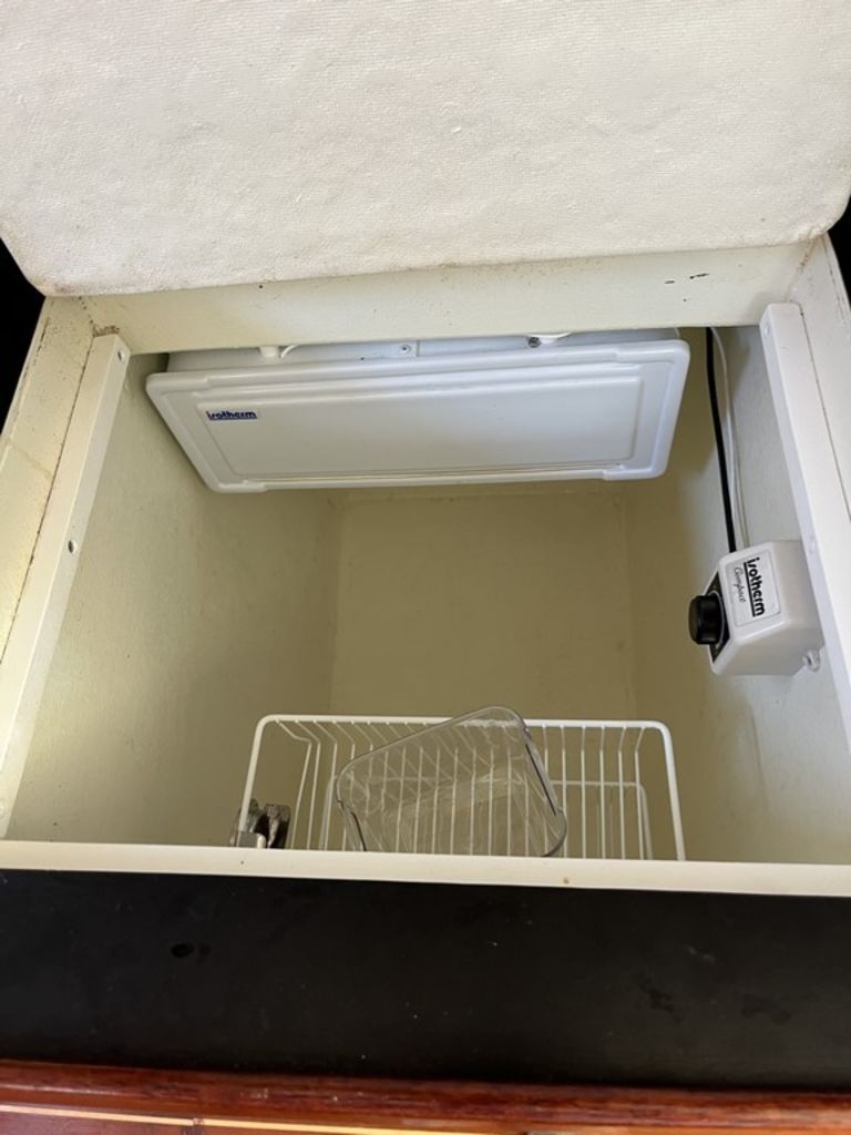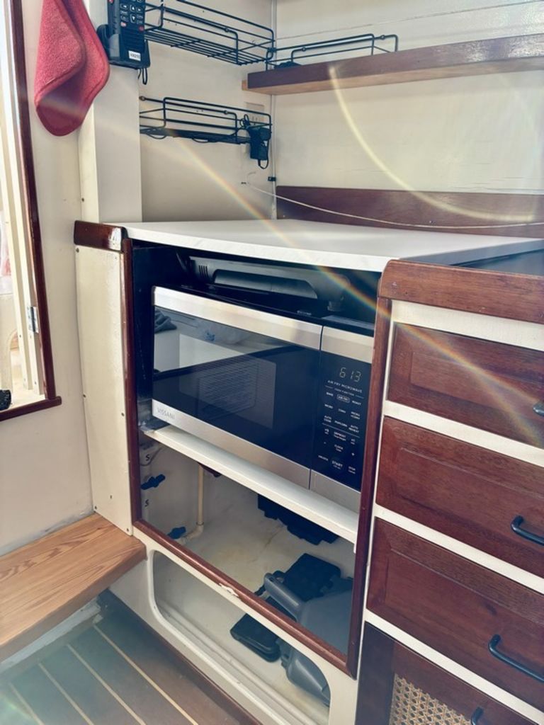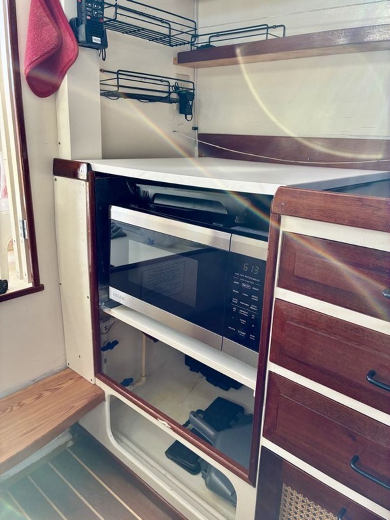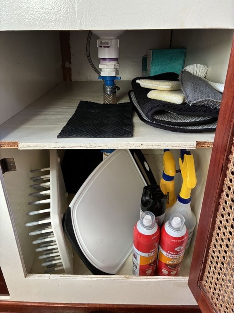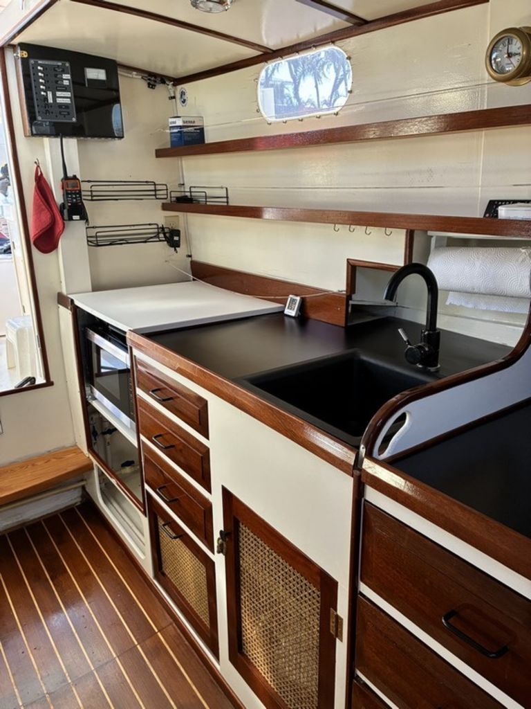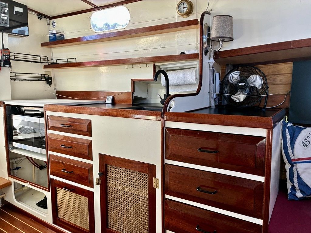 50 gallon freshwater capacity. Hot and cold pressure water. Black composite galley sink basin