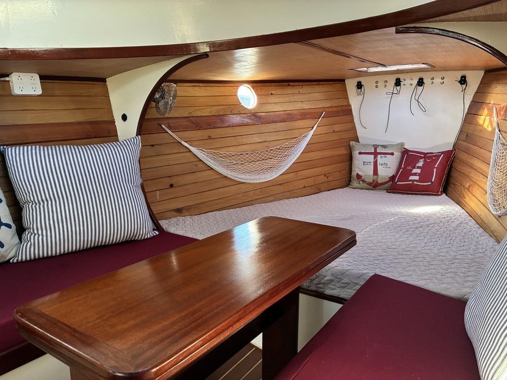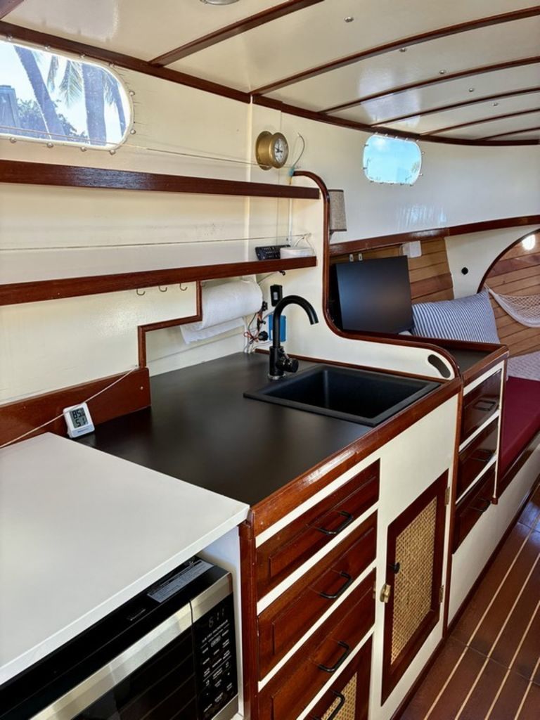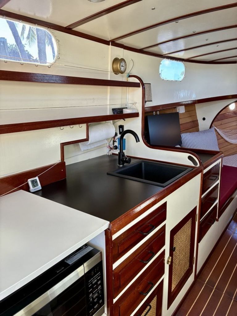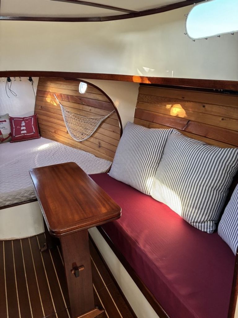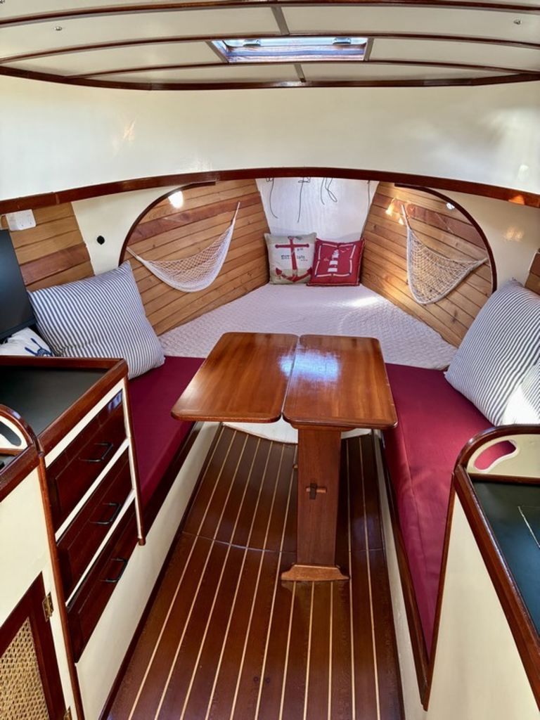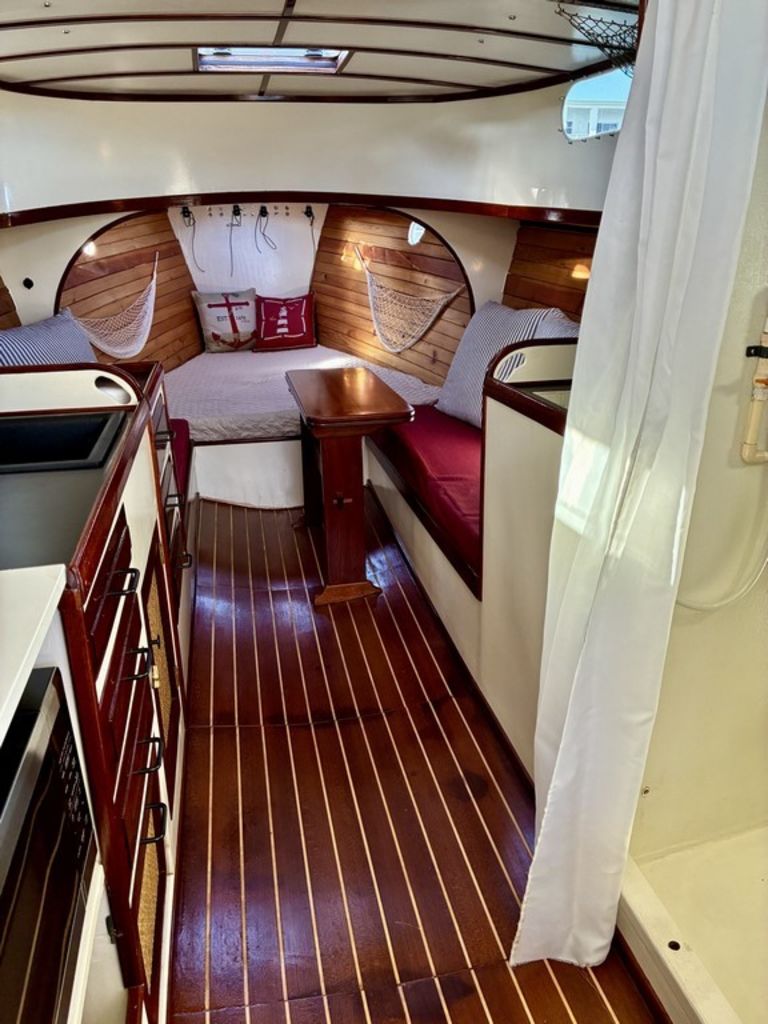 The interior finished in the Herreshoff style of white bulkheads, cabin sides, overhead and joinery accented by varnished mahogany trim and drawer faces.
