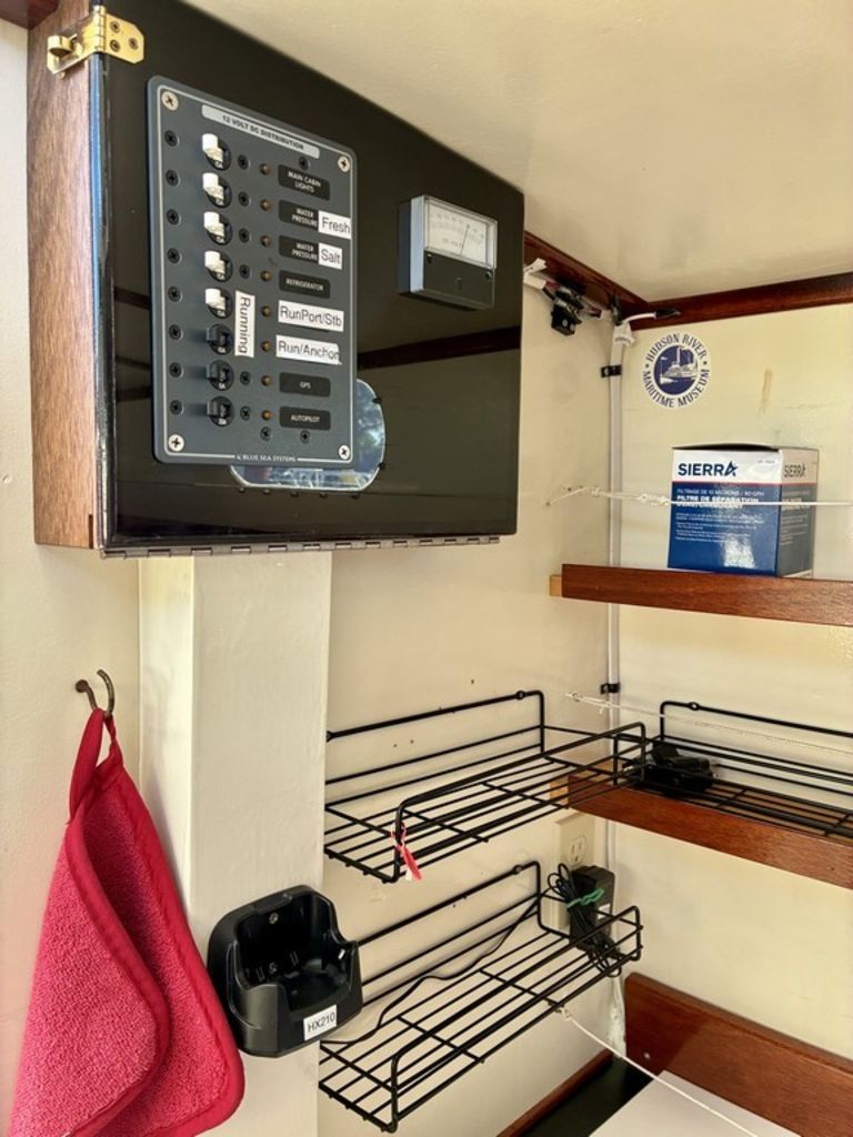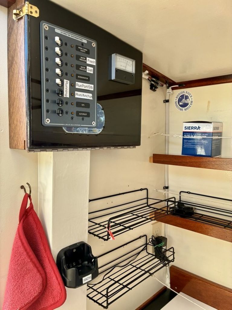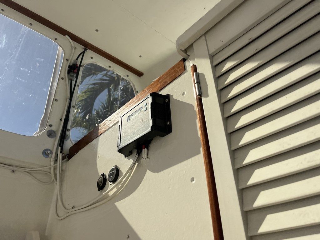 lcom IC-M330 VHF radio GPS and emergency transmitter. Cell phone and tablet docking stations at helm.