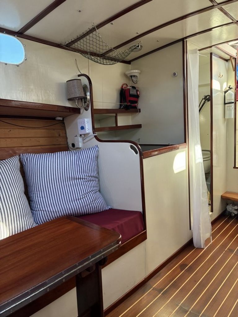 Continuing forward is main saloon with settee seating port and starboard and drop-leaf table to starboard. Starboard settee can be used as a single berthing space.