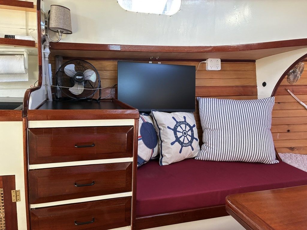 Furthest forward is generous sleeping accommodations for two people in Vee-berth configuration. Lighting and ventilation provided by LED overhead dome and reading lights and fans. There are night-vision red lights where needed (nav station, pilothouse).
