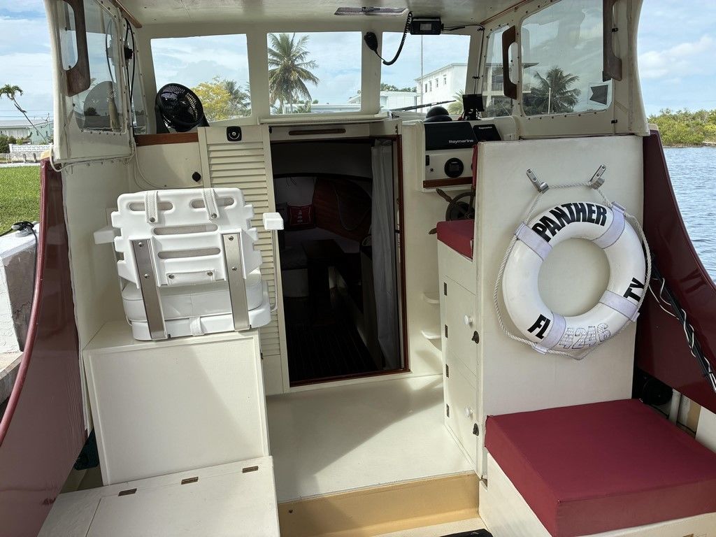 Interior entered by way of companionway door from pilot house. Private head compartment to starboard.