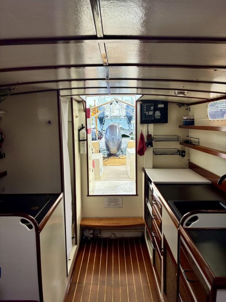 Natural light provided by two hull ports forward, four fixed ports in cabin sides and opening hatches in foredeck and cabin top which also provide natural ventilation.