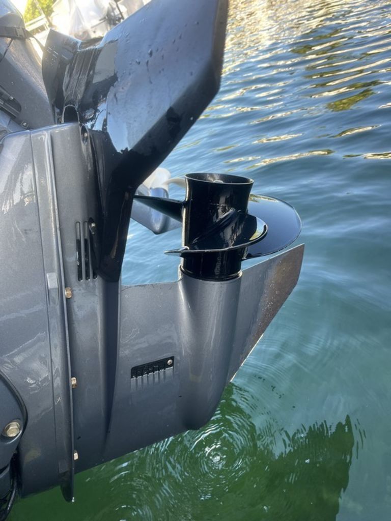 Propeller: Aluminum 3-blade 14x12: three spares of different sizes. Twin transom-mounted electric trim tabs