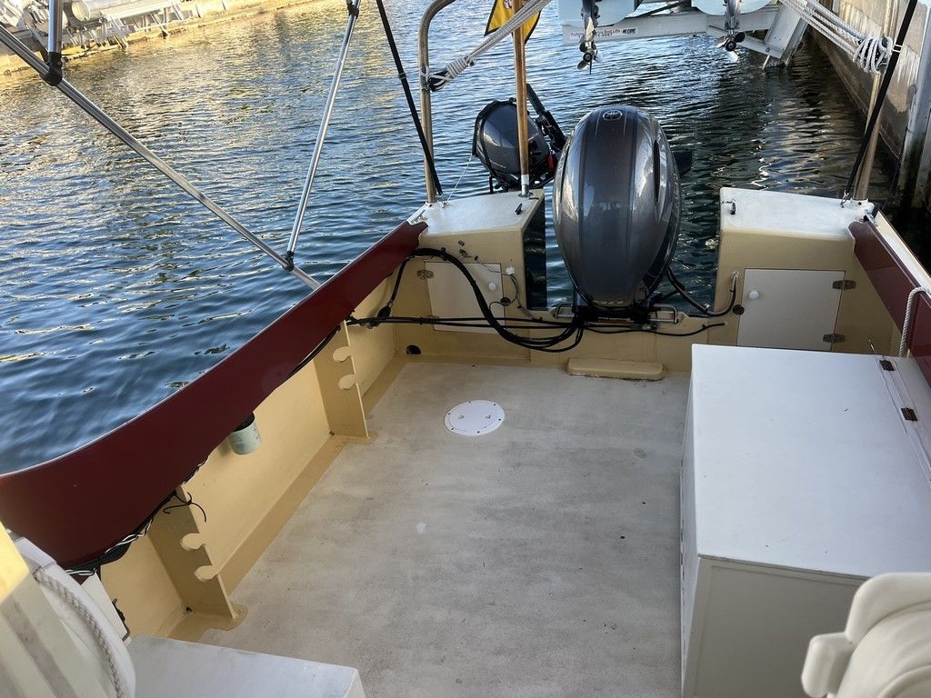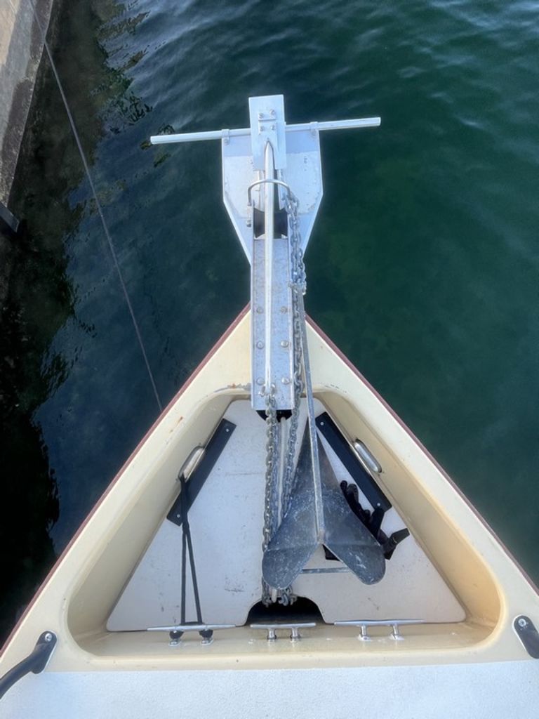 Bow roller incorporated in the heavy-duty stainless-steel anchor bracket. The cockpit well-deck is self-draining through transom scuppers.