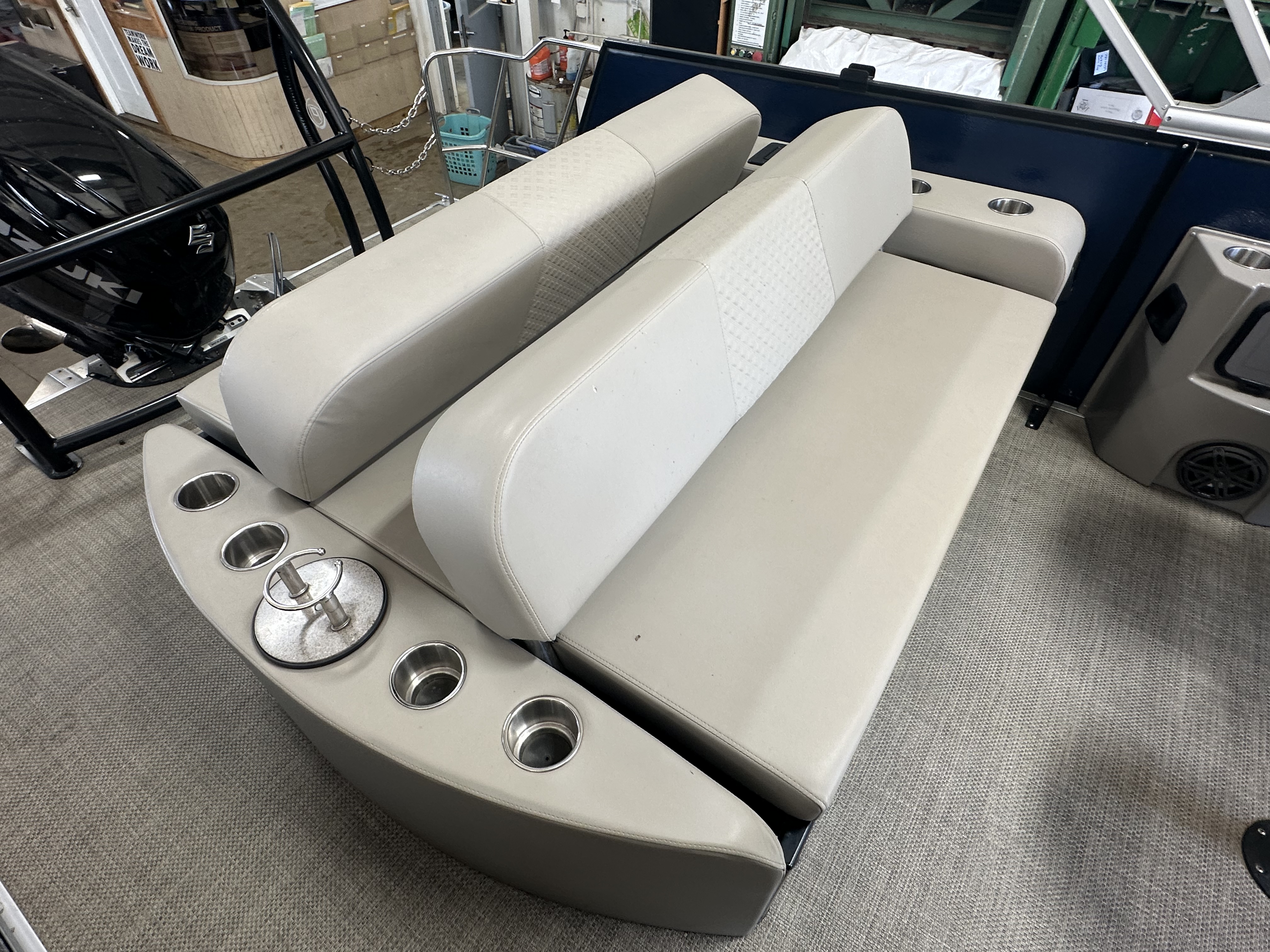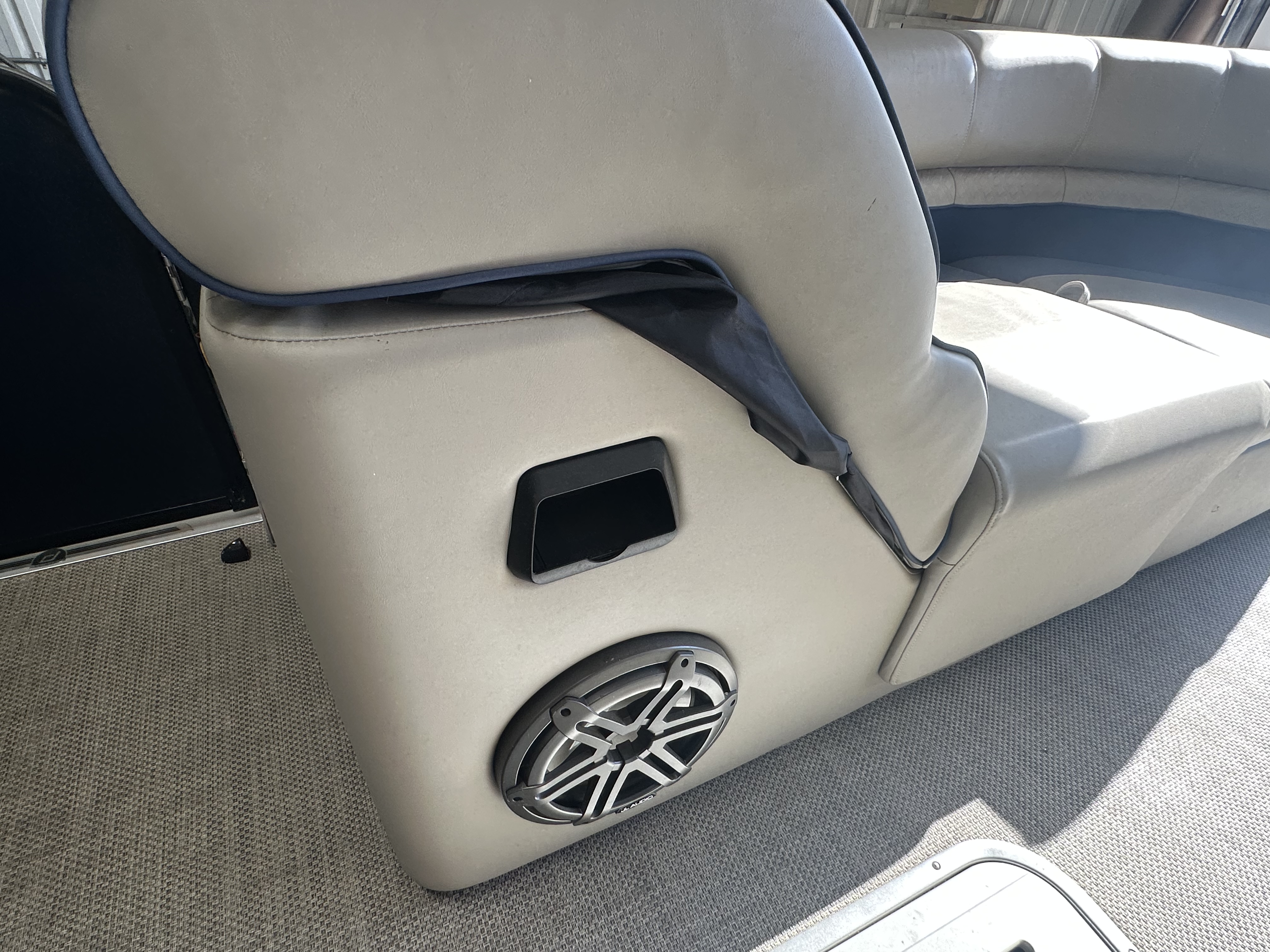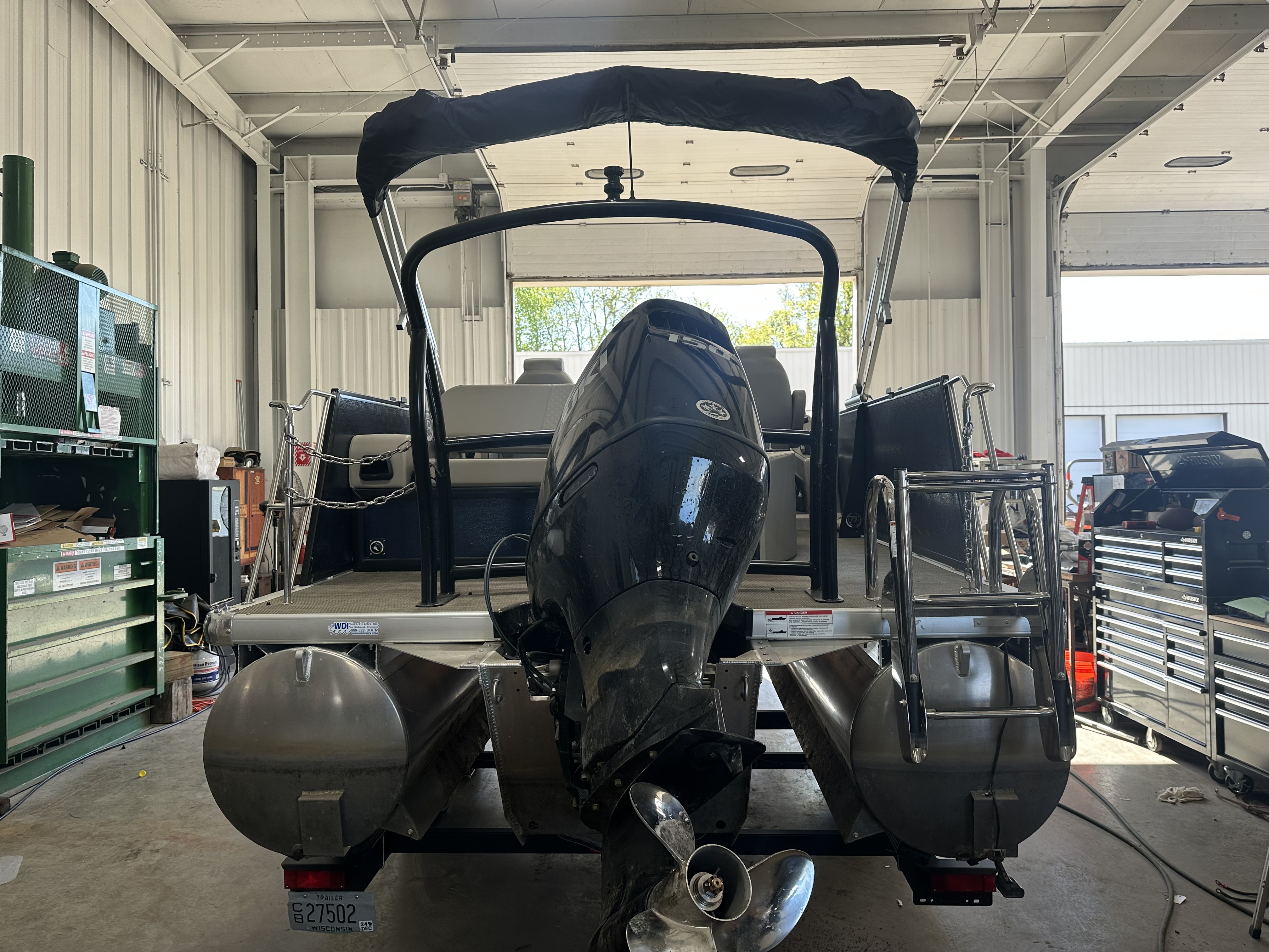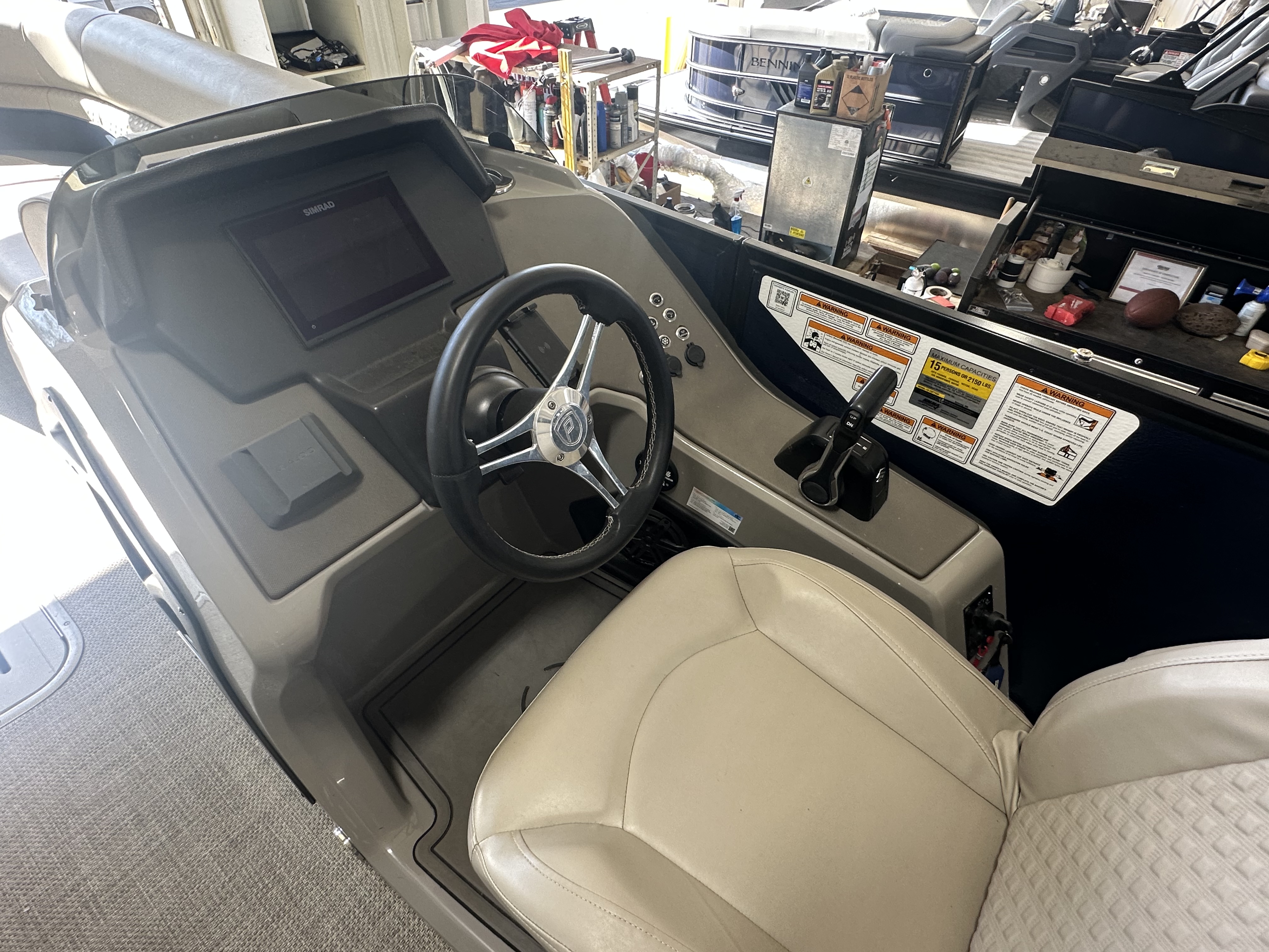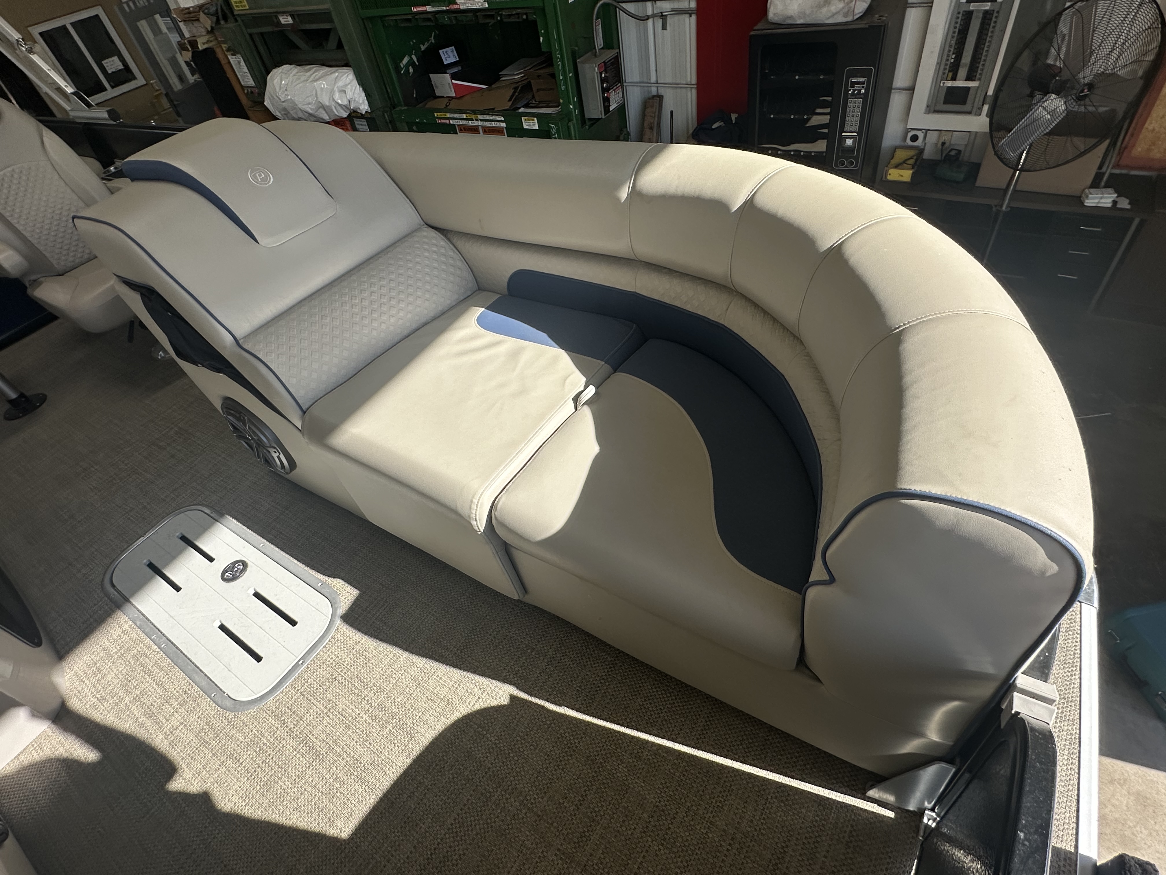 Boat is in great shape! Boat is well equipped with a multi-position rear lounger! Boat is a full tri-toon with ski locker, blackout package, Simrad at console, rear swim ladder, Vantage toon gaurd and wrap, upgraded sound system with sub, elevated helm, rear stainless steel railings, removable boat table, ski tow bar and much more!
