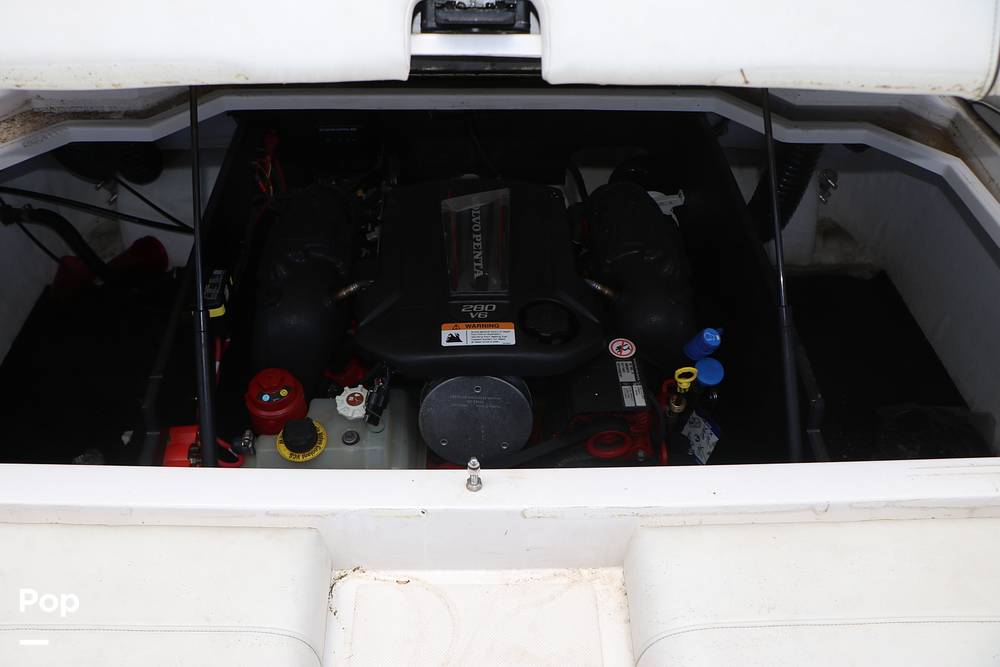 Powered by a Volvo Penta V6 280 engine delivering 280 hp with dual stainless steel props, this boat ensures quick and smooth planning. The collapsible power tower features an integrated Bimini top with a full black canvas cover.