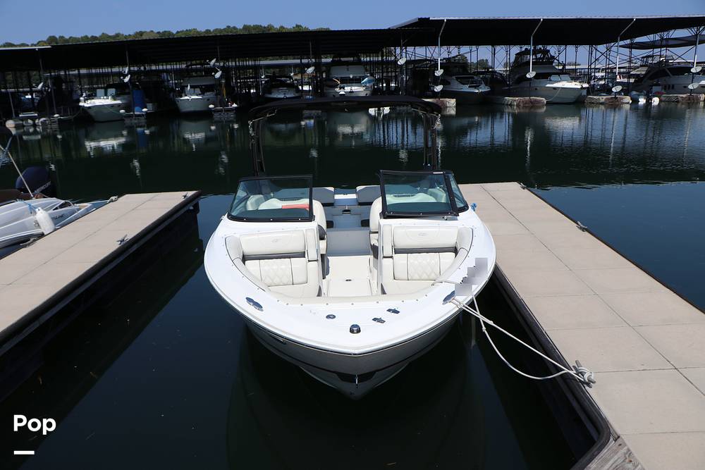 Its Volvo Penta V6 280 engine, paired with dual stainless-steel props, delivers smooth acceleration and reliable performance. The collapsible power tower includes an integrated Bimini top and full black canvas cover for added shade and style.
