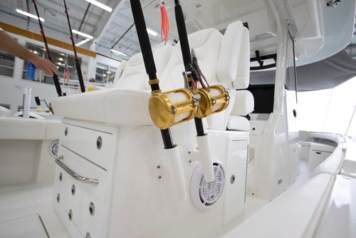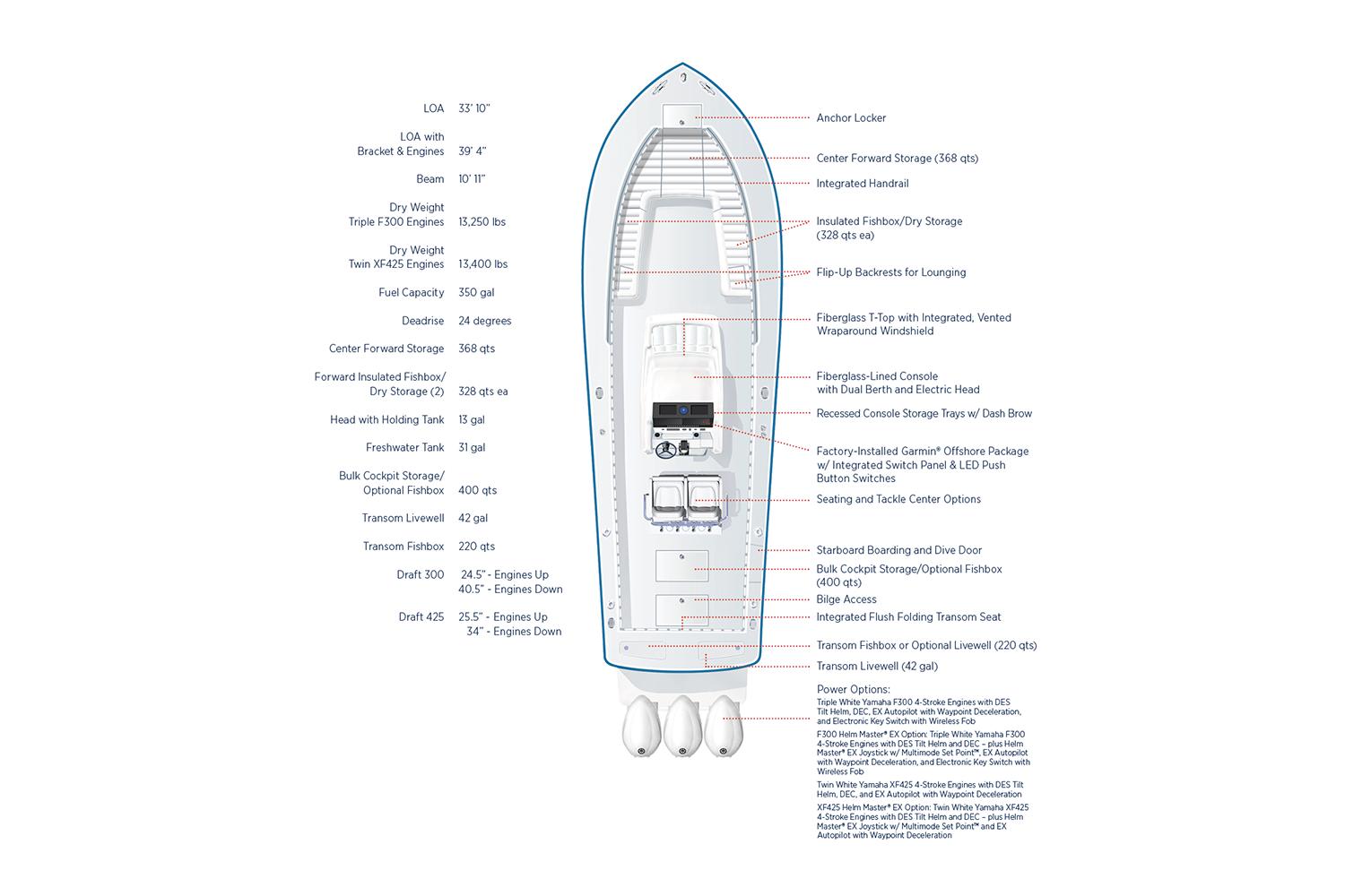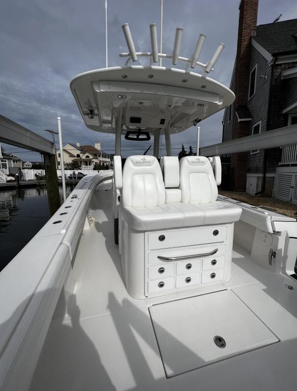 The Regulator 34 is a true center console, with a design that maximizes space to rival its 39-foot competitors. Fishermen’s favorites include a huge forward deck, 42-gallon transom livewell, 220-quart transom fishbox, and 3X Deluxe Tackle Center with rigging station. Below deck, the berth sleeps two and features abundant rod rack storage, among other overnight amenities, making the 34 a favorite again and again.