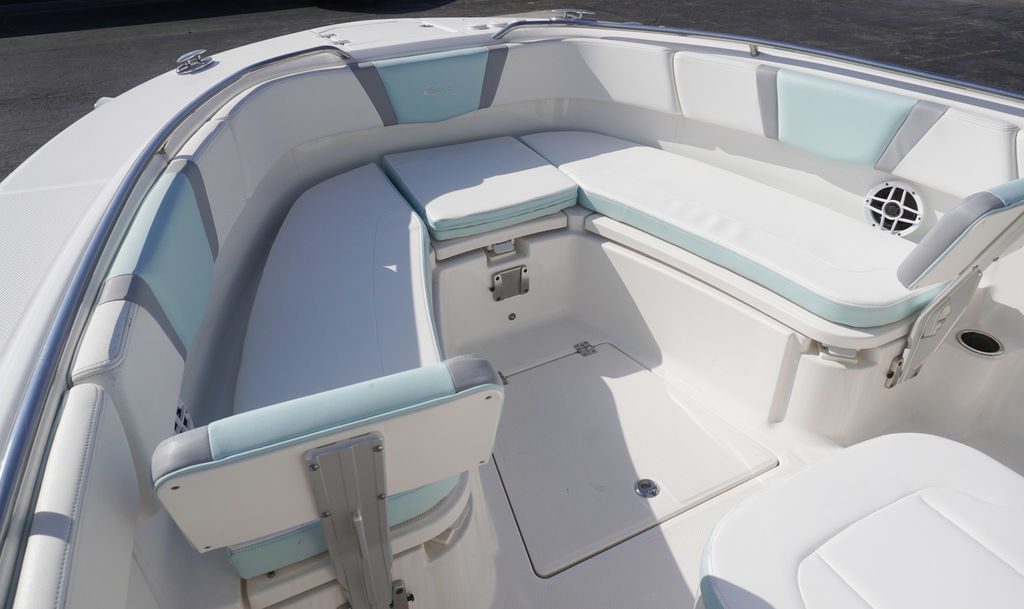 Premium seating & upholstery with forward lounge seating and fold-down transom bench
