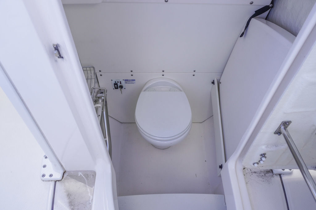 Spacious head compartment with toilet and storage