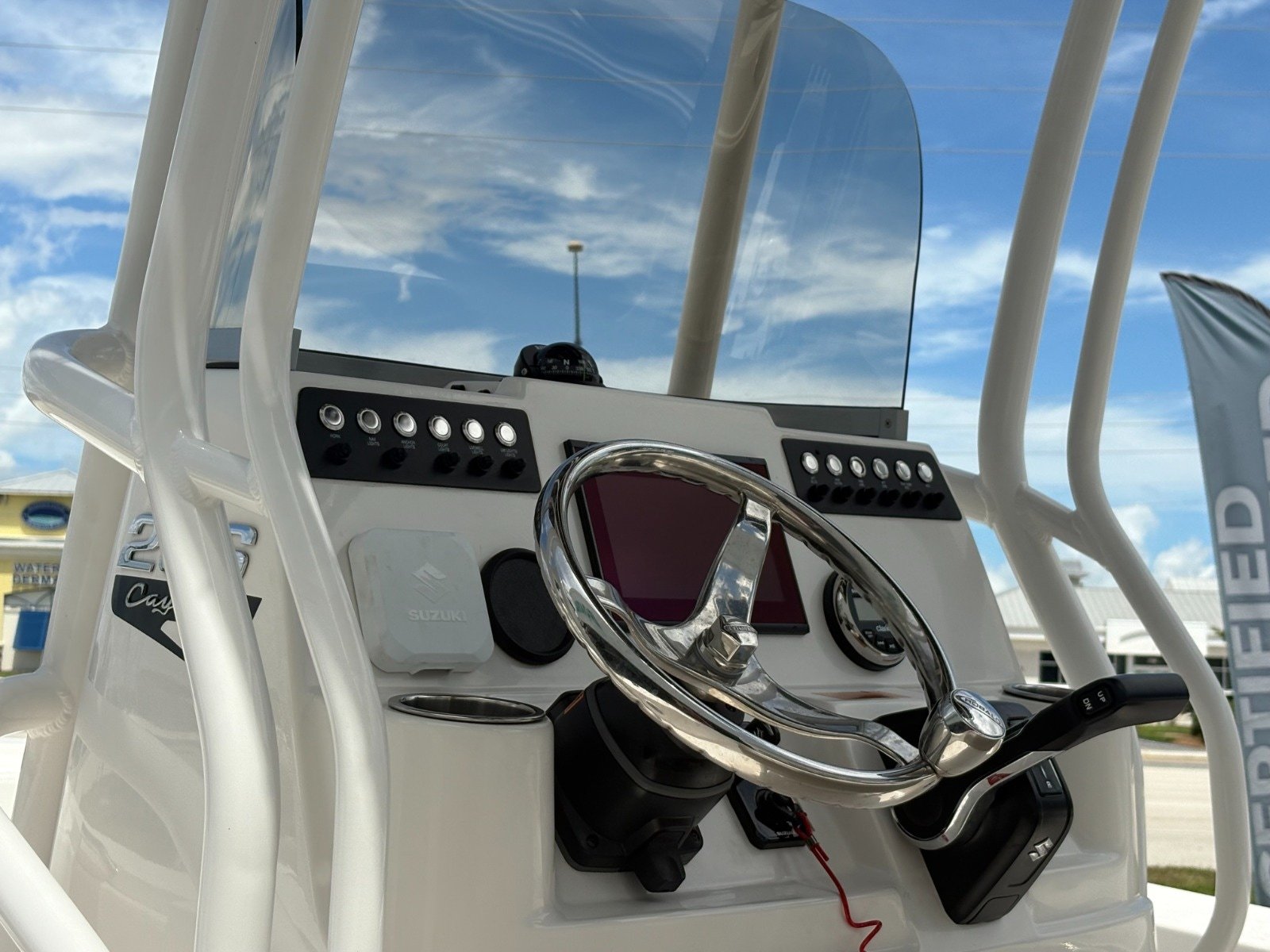 The incredible 206 Cayman S has a feather soft 15-degree Extended V-Plane bottom design and an aggressive hullside flare so you can travel wherever the fish are biting. Big on features and even bigger on performance, we've made it easy to fall in love with the 206 Cayman S. Upfront, there is ample seating with 2 removable backrests. Amidships, the helm console that's more stylish and functional than you've ever seen in a 20-footer. Six rods store at the ready. This boat is powered by a brand new 150HP Suzuki motor and includes a 5-year factory warranty on the motor from Suzuki. Trailer Sold Separately.