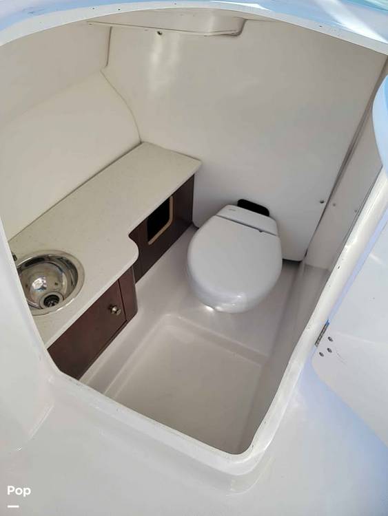Inside, the spacious dual console layout includes comfortable port and starboard seating with a removable aft bench, convertible forward loungers, and a helm seat with a flip-up bolster. The portside console features an enclosed head. Equipped with an 8-gallon holding tank, and freshwater sink. A 13.5-gallon freshwater system feeds the cockpit shower and wet bar sink.