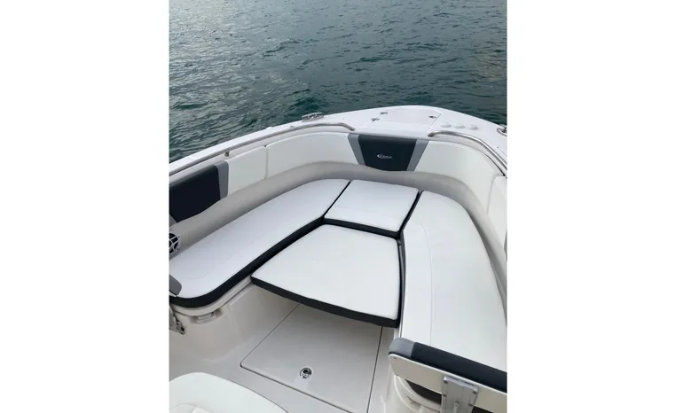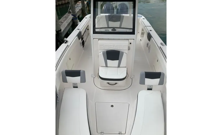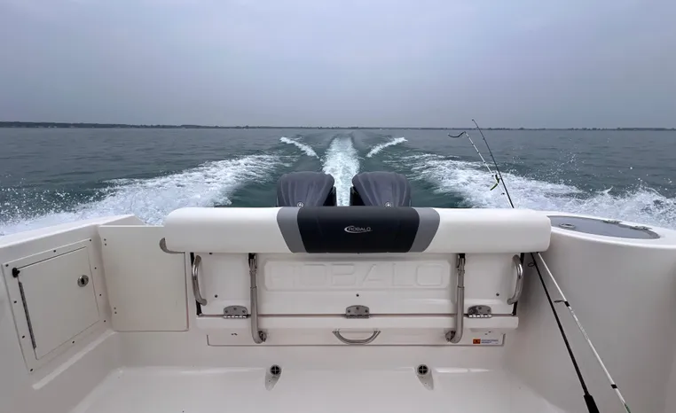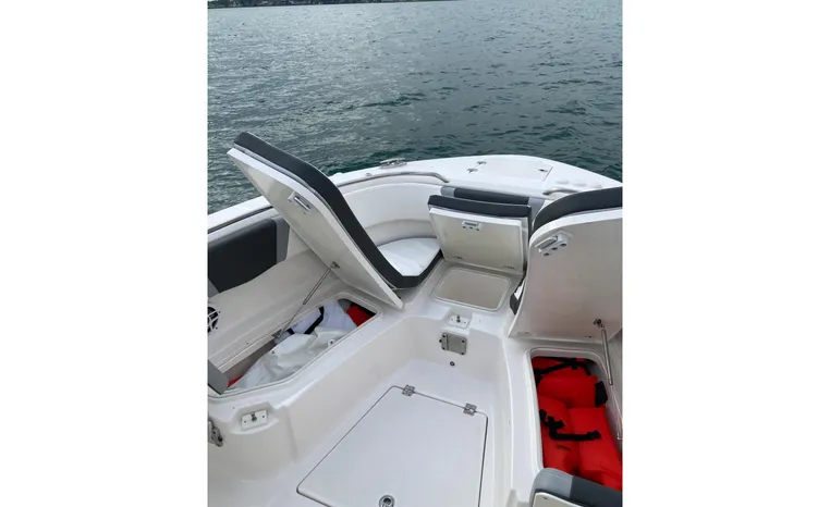 Designed for fishing and entertaining, the R272 is a solid, well-built center console from a builder that gets things right. Like many of today’s high-end center consoles, the R272’s hardtop and windshield are integrated into the helm console. The doublewide helm seat includes flip-up bolsters, and a removable table converts the U-shaped bow seats into a casting platform. Fishing features include a 30-gallon transom livewell, a 100 gallon in-deck fishbox, twin 25-gallon fishboxes forward, raw water washdowns, six gunnel-mounted rod holders, and stainless-steel toe rails. The seat behind the helm flips up to reveal a second 20-gallon livewell. A fiberglass hardtop comes with LED lights and four rod holders with outriggers among the options. Note the power vent window in the windshield. The front console seat swings open for access to the small head compartment. In the cockpit, a foldaway transom bench seat, an aft-facing seat, and a portside dive door are standard. Built on Robolo’s signature Kevlar-reinforced hull.