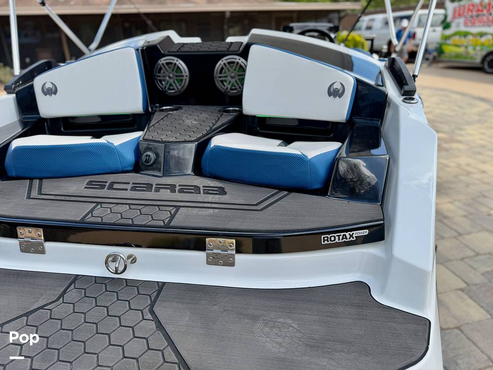 This Scarab is equipped with a premium JL Audio marine sound system rated at approximately 700 watts with a five-channel amplifier and Bluetooth connectivity Factory custom LED lighting package installed throughout the speakers, floorboards, and seating areas, creating a distinctive appearance when operating in the evening.