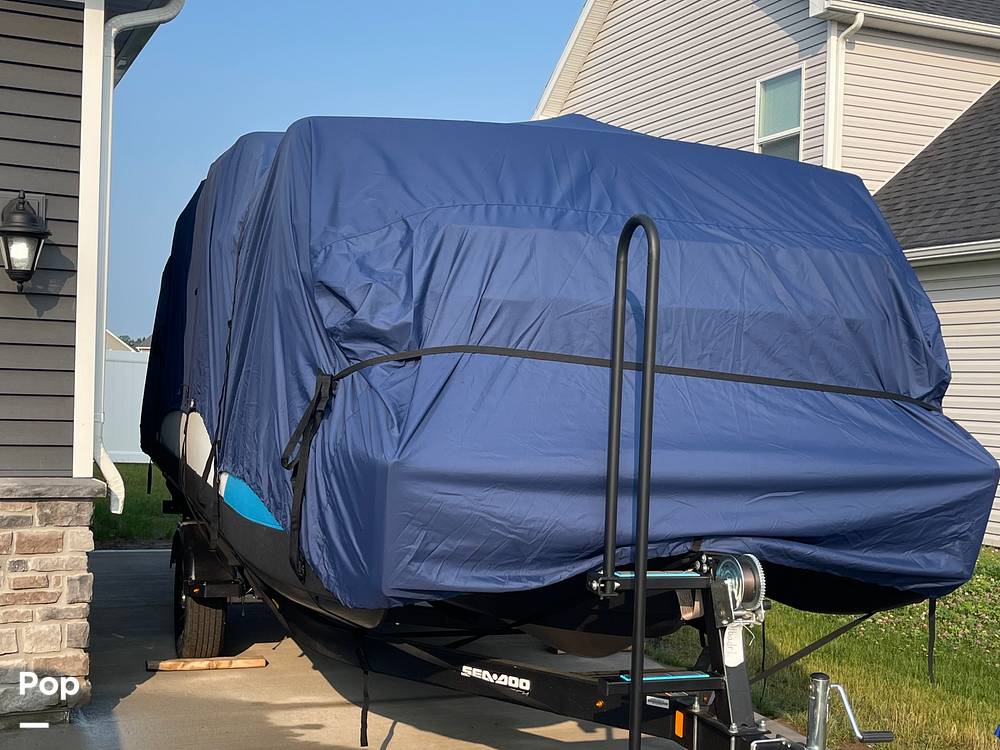 Features include a double bimini which provides tons of shade, a Garmin 7" touchscreen GPS, large swim platform, full boat cover, BRP waterproof stereo with two 50 watt speakers, and more.