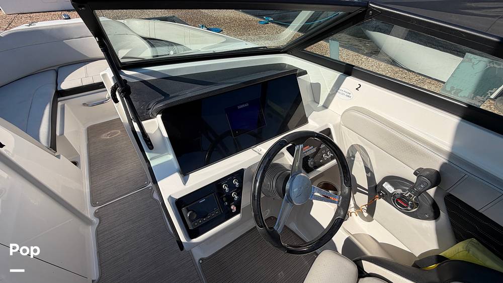 The spacious cockpit is thoughtfully designed with premium marine-grade upholstery, wraparound seating, and ample storage throughout, creating a comfortable and social layout for guests. A bimini top offers welcome shade on sunny days, while the integrated Simrad display provides modern navigation and system monitoring for added confidence at the helm.
