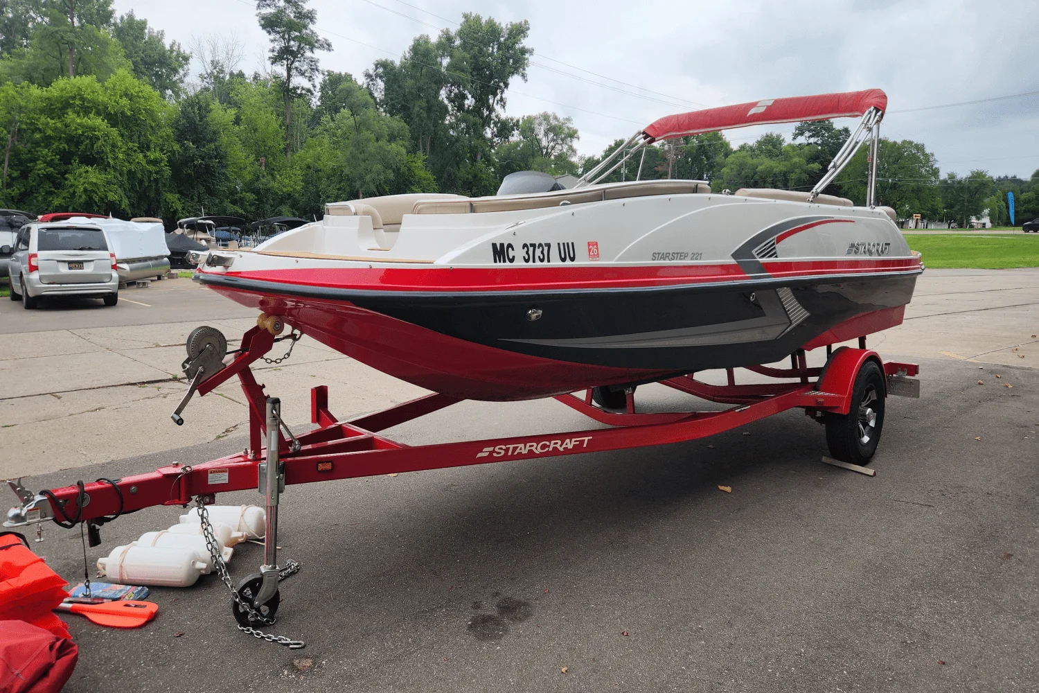 Check out this 2022 Starcraft 221 Starstep and make every day on the water unforgettable! - The ultimate blend of performance, comfort, and style. Whether you're cruising the lake, pulling skiers, or anchoring at the sandbar, the 221 StarStep delivers with its spacious layout, powerful performance, and premium amenities. This 2022 Starcraft 221 Starstep is the perfect boat for friends, family or a day or cruising out on the lake. Options included are the legendary 4.5 Mercruiser V6 sporting 200 HP. Good enough for speeds in the 40mph range. Snap in marine mat, cover, accessories and matching trailer is included!