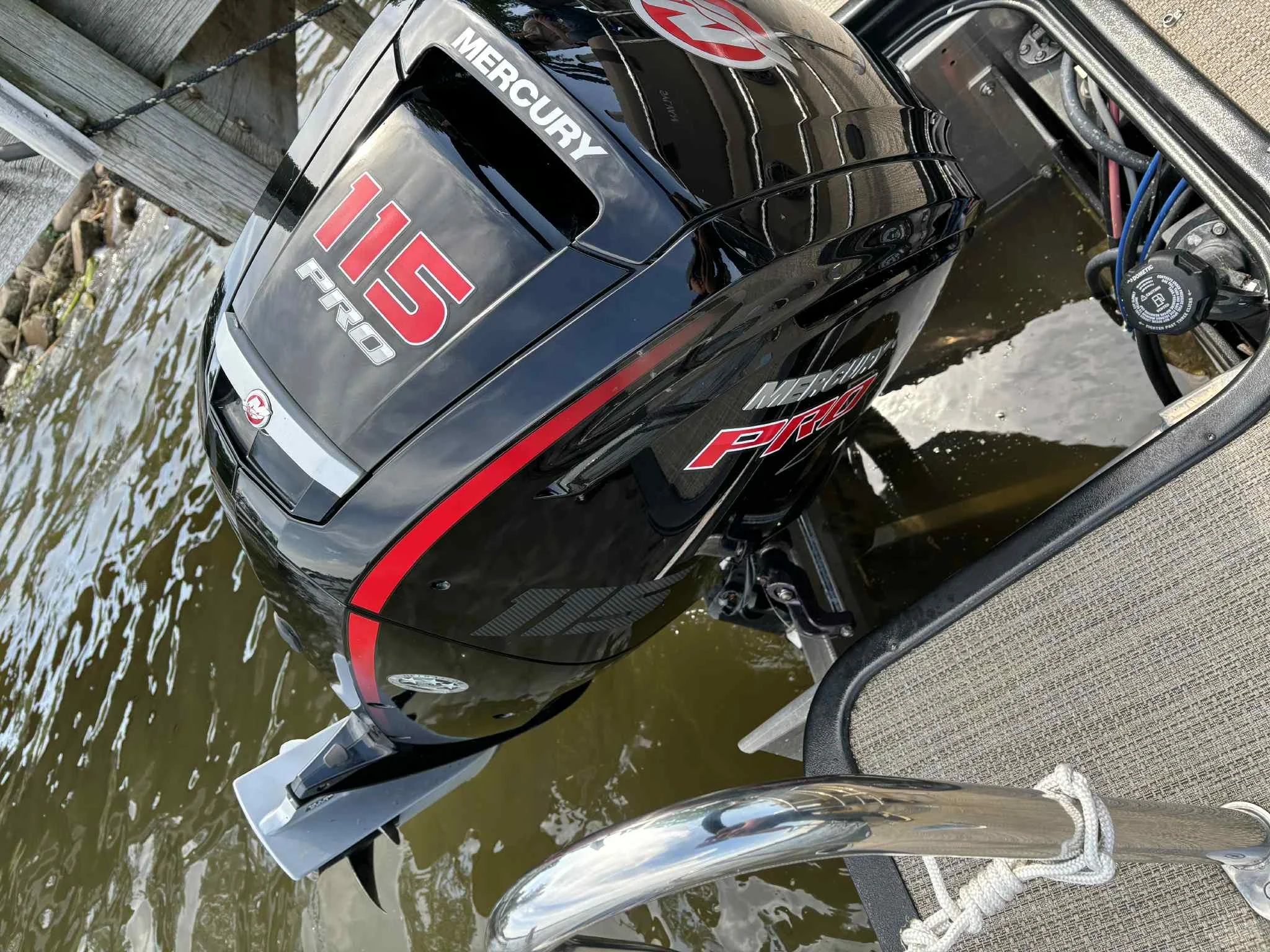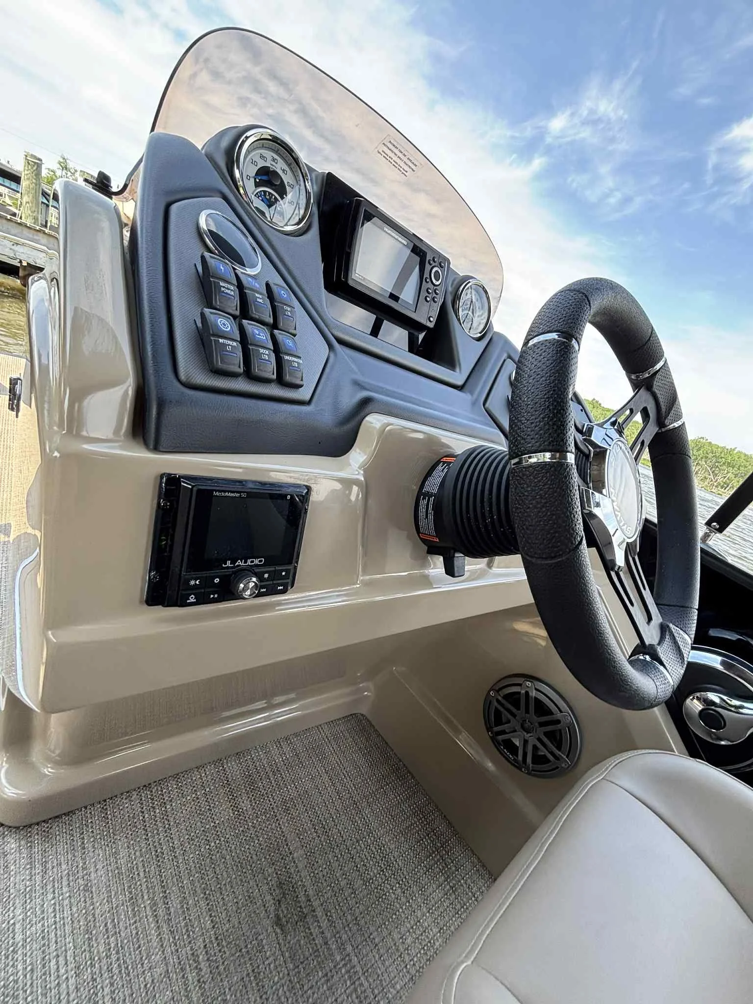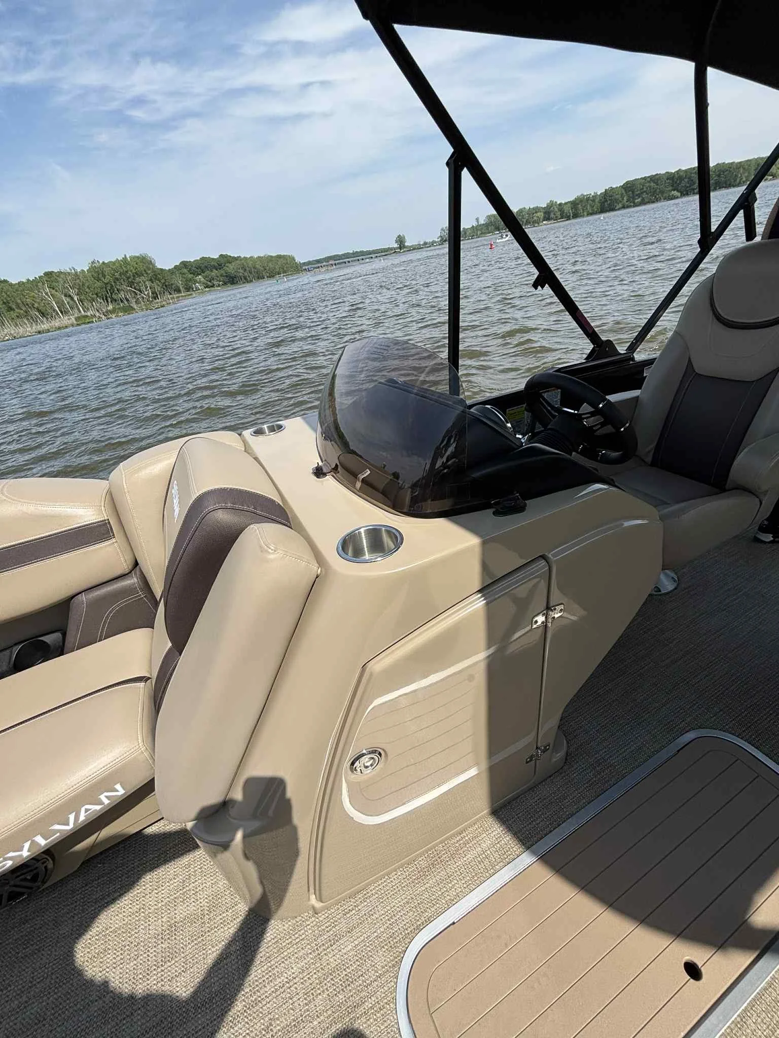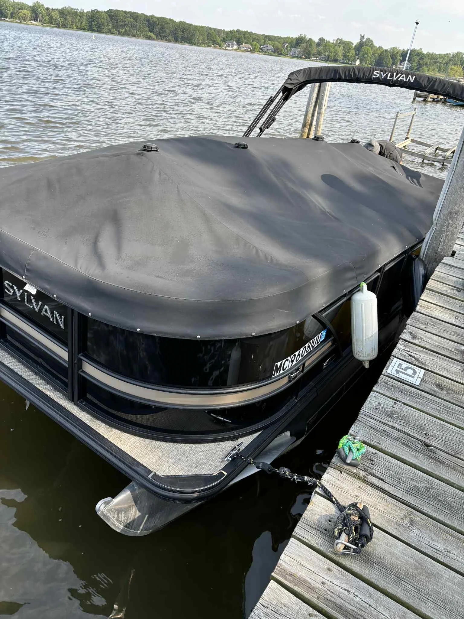 2022 Sylvan L1 DLZ Tritoon with Mercury 115hp Pro XS Outboard - The ultimate adventure awaits! Set sail in style with the 2022 Sylvan L1 DLZ Tritoon, powered by the reliable Mercury 115hp Pro XS Outboard. Whether you are cruising, fishing, or enjoying a day of watersports, this boat is built for performance and comfort. Equipped with a power bimini top for effortless sun protection and a full playpen cover to keep everything clean and dry when docked, this boat is designed to make every outing easy and enjoyable. You will also enjoy convenient features like a depth finder to keep you safe on the water, lighted cup holders for nighttime ambiance at the helm, and sleek black rails that add a touch of modern style. Don't wait, make the most of your time on the water with a boat that is built to impress. Financing available!