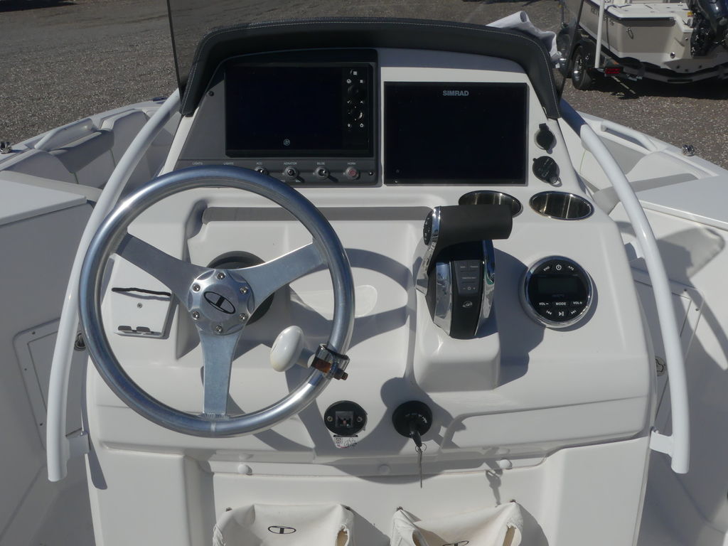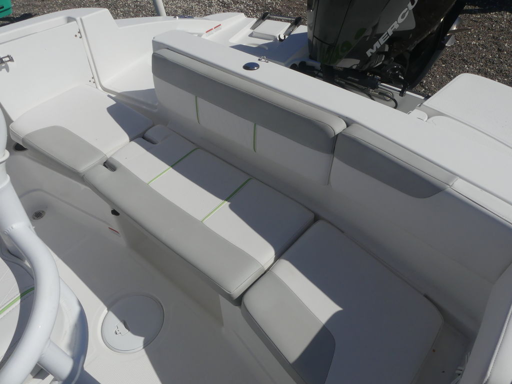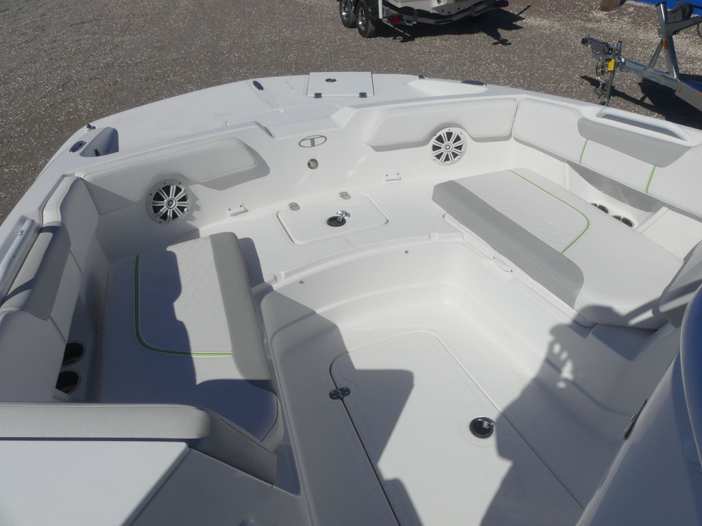 When it’s time to fish, the center console means you can cast and work your catch from all sides of the boat without anything getting in the way. Plus, the standard depthfinder reveals right where your catch it at. You can also lounge on the comfortable seating throughout, including under the standard Bimini top aft. Or, take a dip off the fore and aft swim platforms—both with telescoping boarding ladders so you can reboard and do it again!