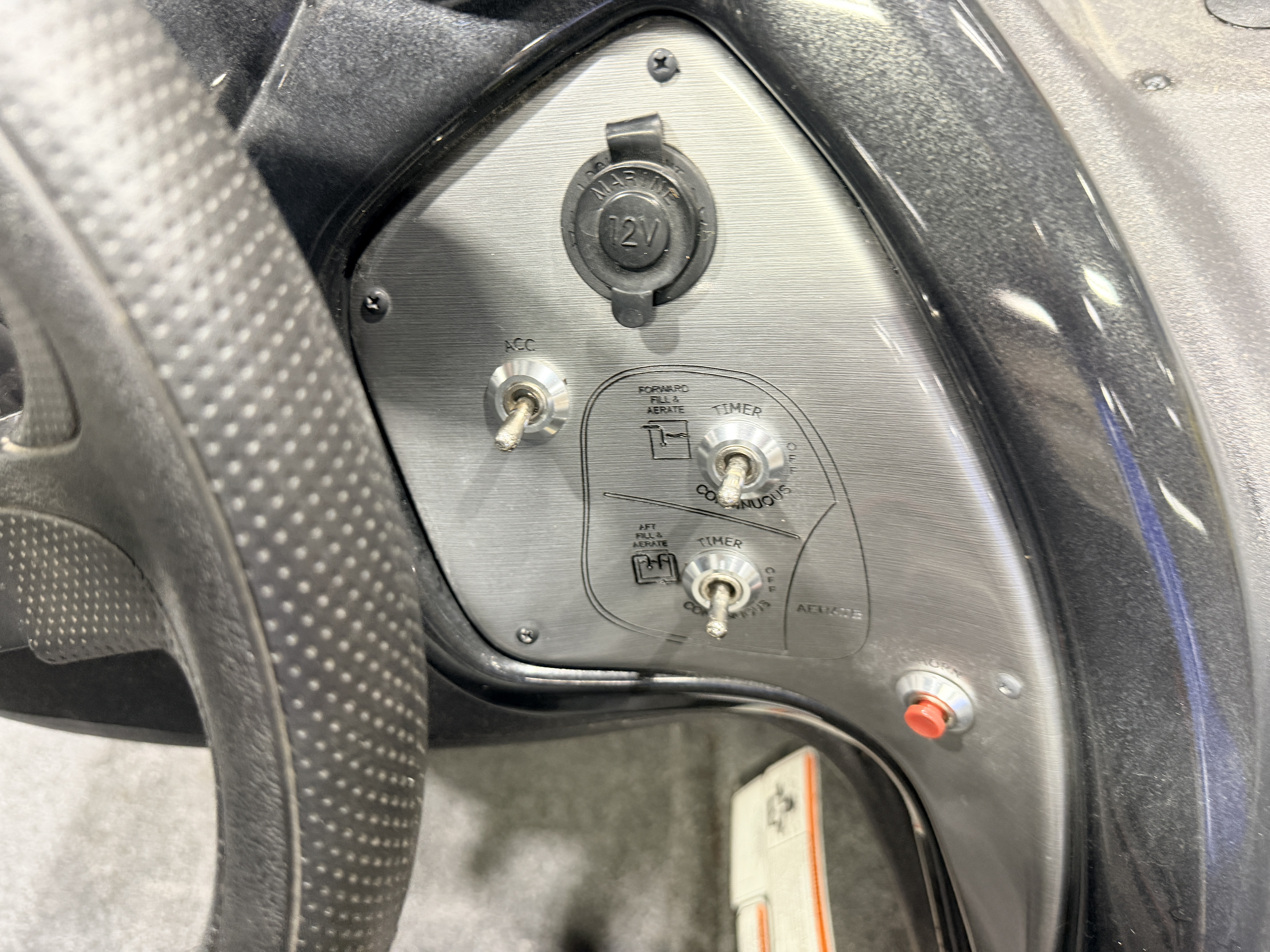 item trays. The helm features a courtesy light on the side, a Speedometer,