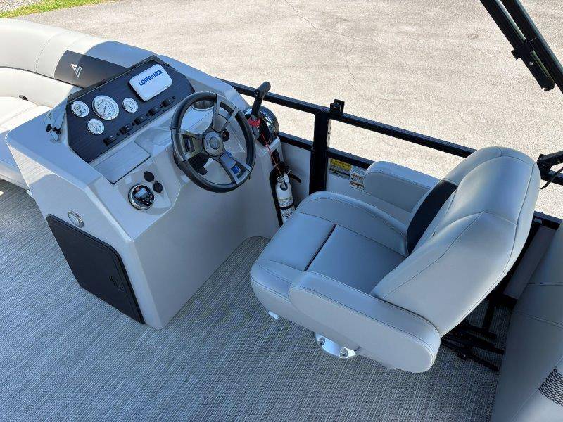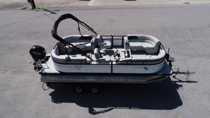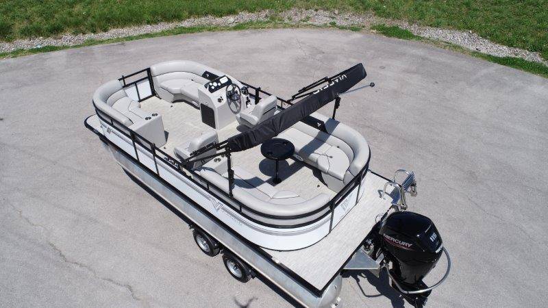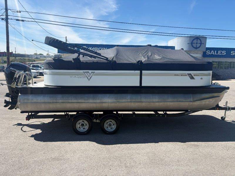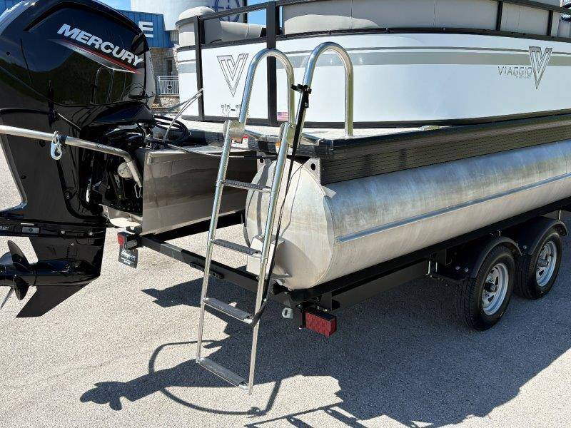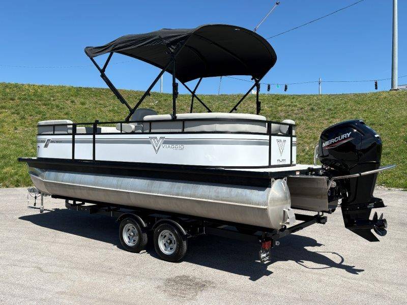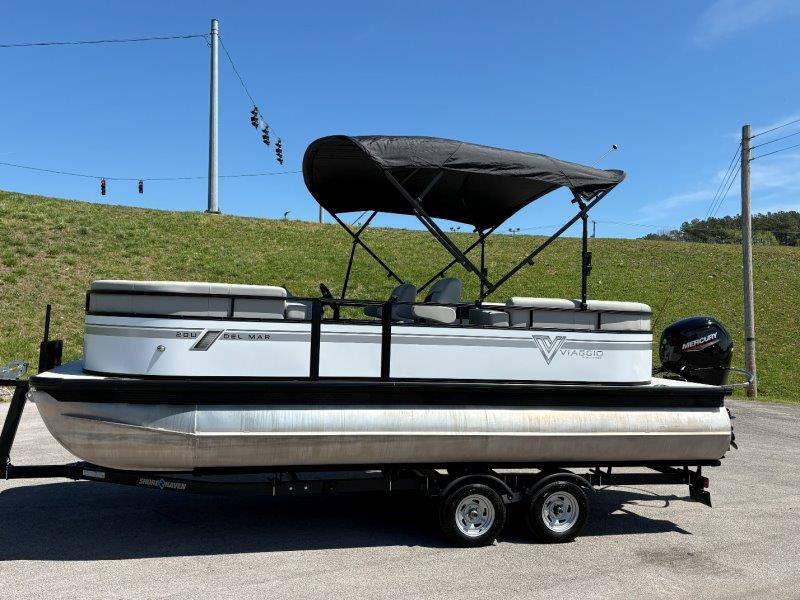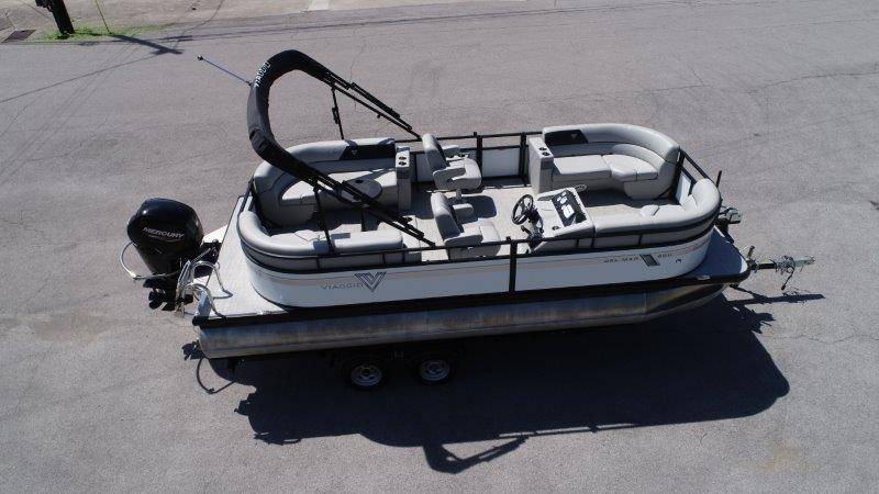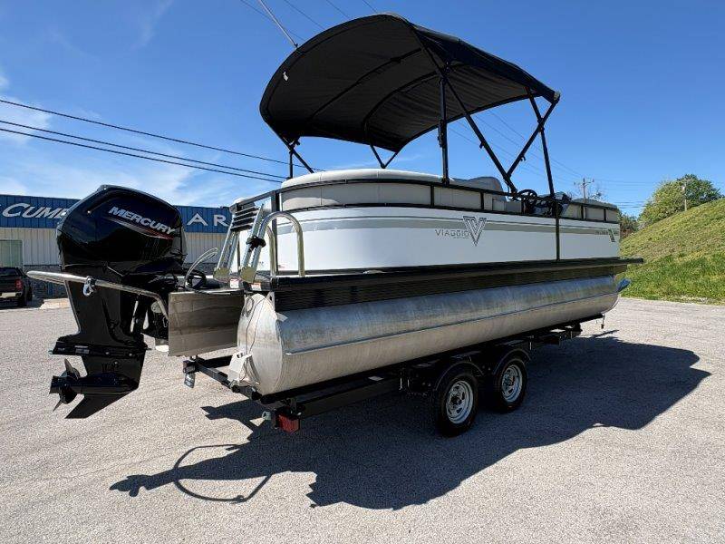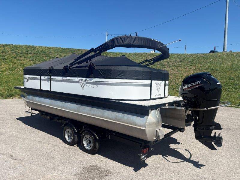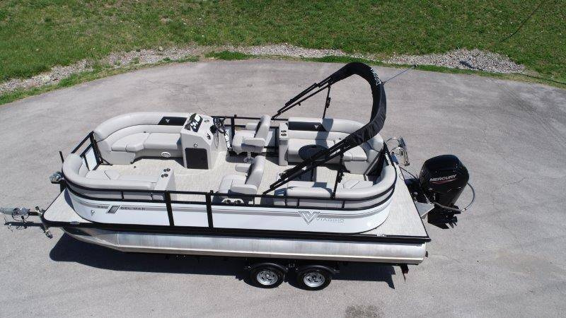 2022 Viaggio DM20U Mercury 115 Command Thrust (73 hours) 4 Blade Aluminum Prop Rear Boarding Ladder Turbo Swing Tilt Steering Boss Bluetooth Audio Lowrance Fish Finder – GPS RPM, Volt, Fuel & Trim Gauges Bimini Top with Boot Full Cover 11 Passenger Capacity Dual Axle Trailer with Surge Brakes