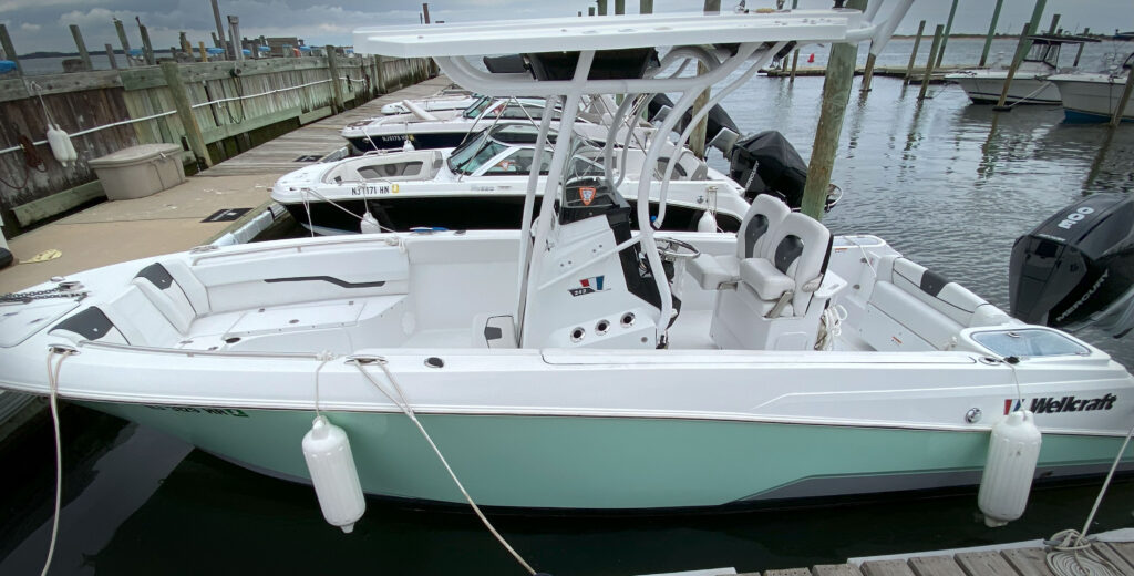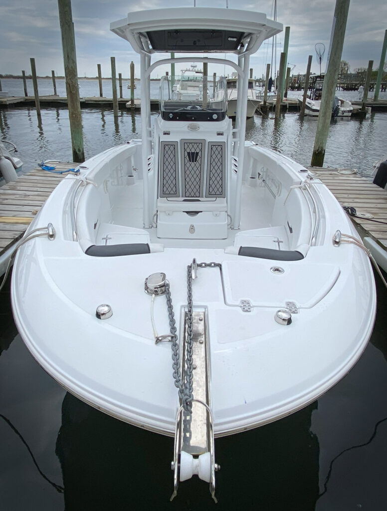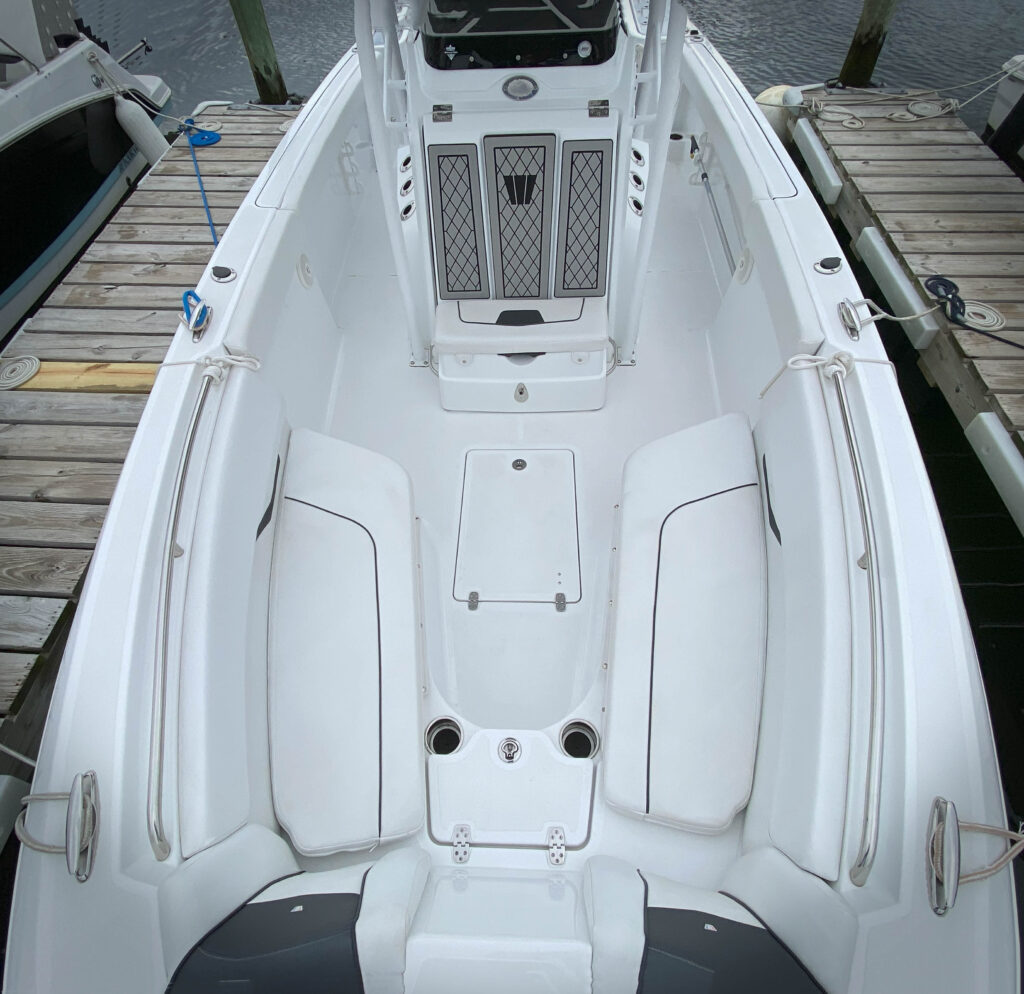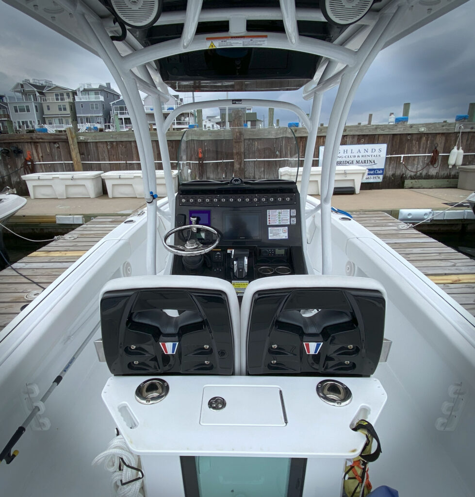 The bow seating package grants additional comfort to passengers, making this boat perfect for family outings. Features include VHF radio and stereo system, deluxe fiberglass T-Top, Garmin GPS and depth sounder, and more!