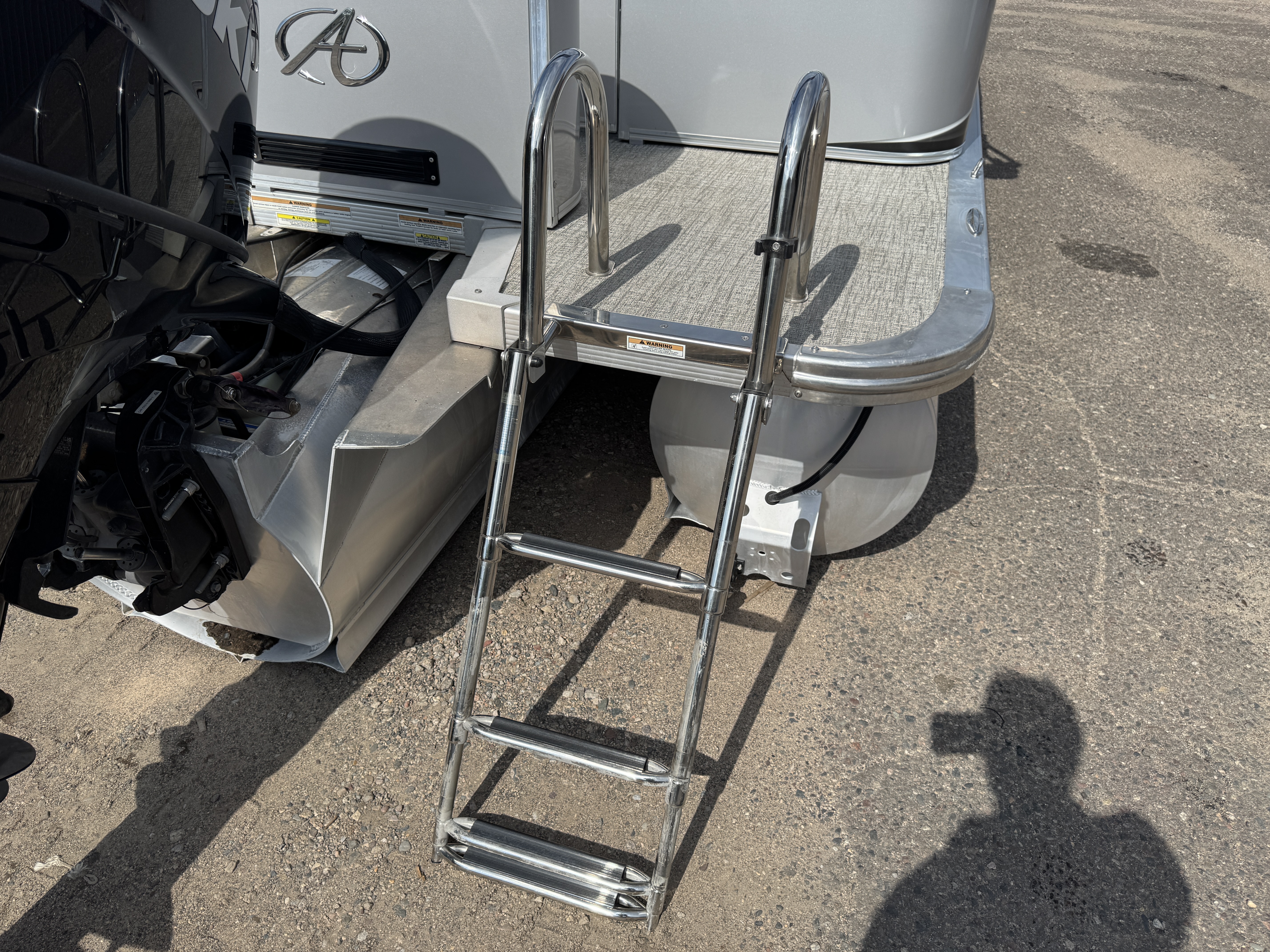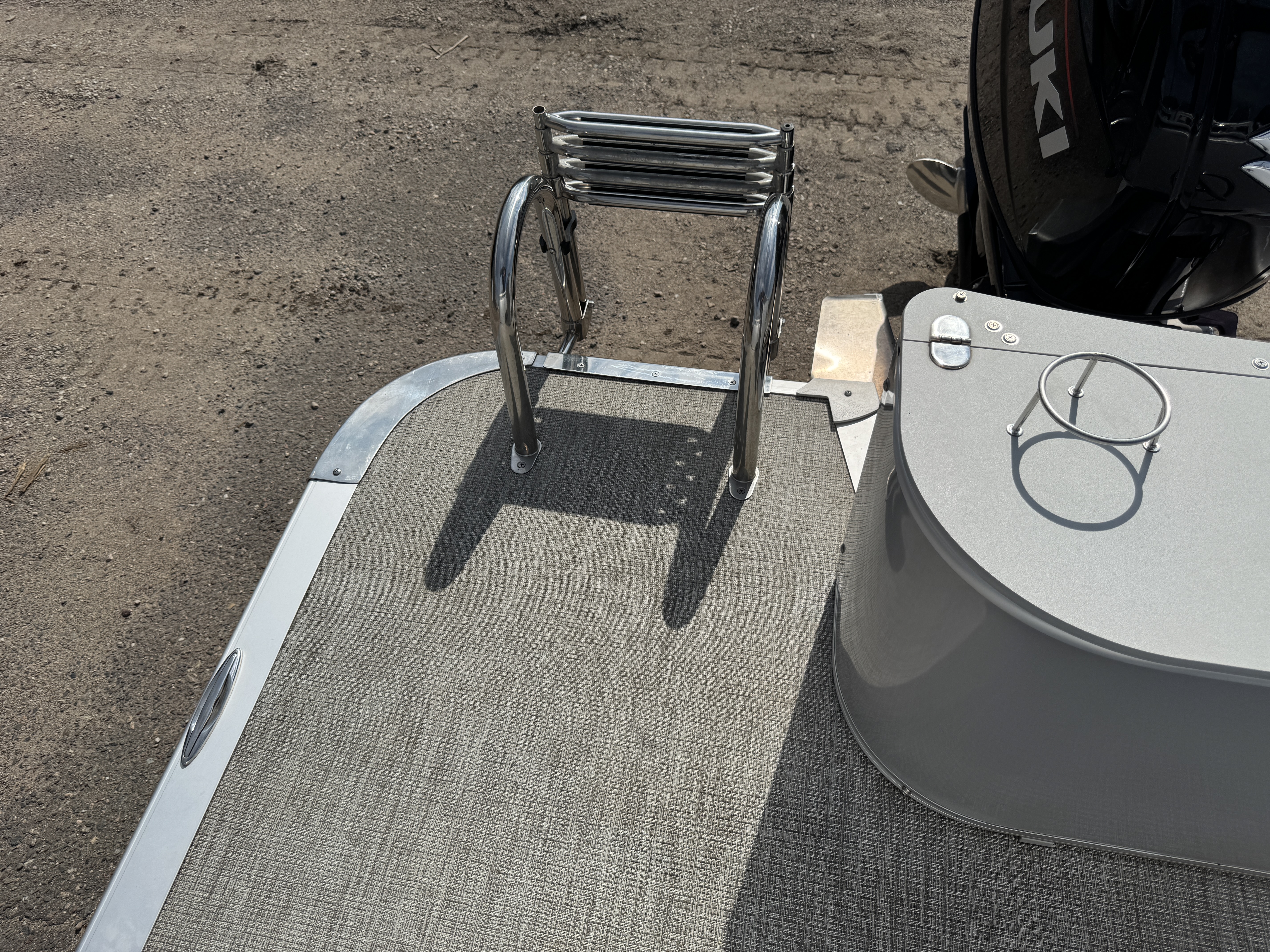 There is a stainless steel fold down swim ladder.