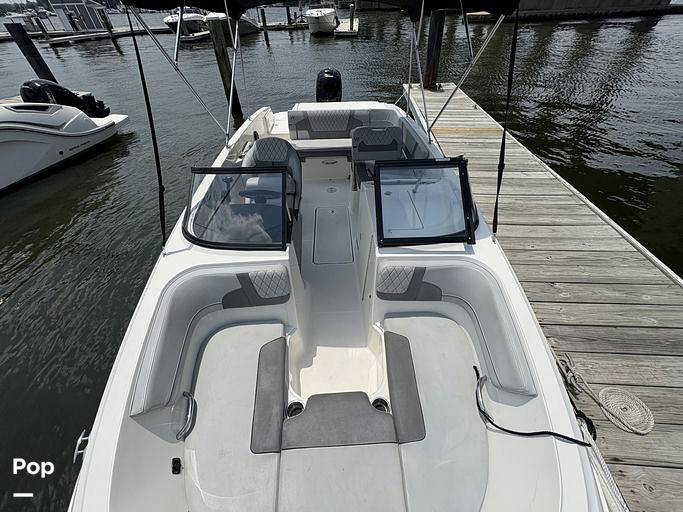 Measuring 22 feet in length, the Bayliner VR6 features a sleek, modern design with ample seating for up to 10 passengers. Its layout includes comfortable bow seating, a roomy cockpit, and a large swim platform, making it ideal for relaxing, socializing, or enjoying water activities. The boat has a Bluetooth stereo system, a GPS, and a convenient swim ladder for easy access to the water.