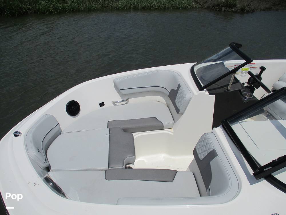 The L-shaped cockpit seating allows guests to stretch out. Up front, there is spacious bow seating with easy-to-reach grab handles and cupholders. At the stern, there is a nice sun pad that will have you lounging in style.