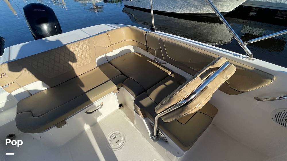 The Bayliner VR6 OB has seating for up to 10 passengers, a spacious layout with comfortable bow seating with storage below, a nice shady bimini, and a large swim platform. It includes a Bluetooth stereo system, a Simrad GPS, and a swim ladder for easy water access. There is a privacy compartment that will easily fit a porta-potty! The passenger seat has a flip-flop backrest.