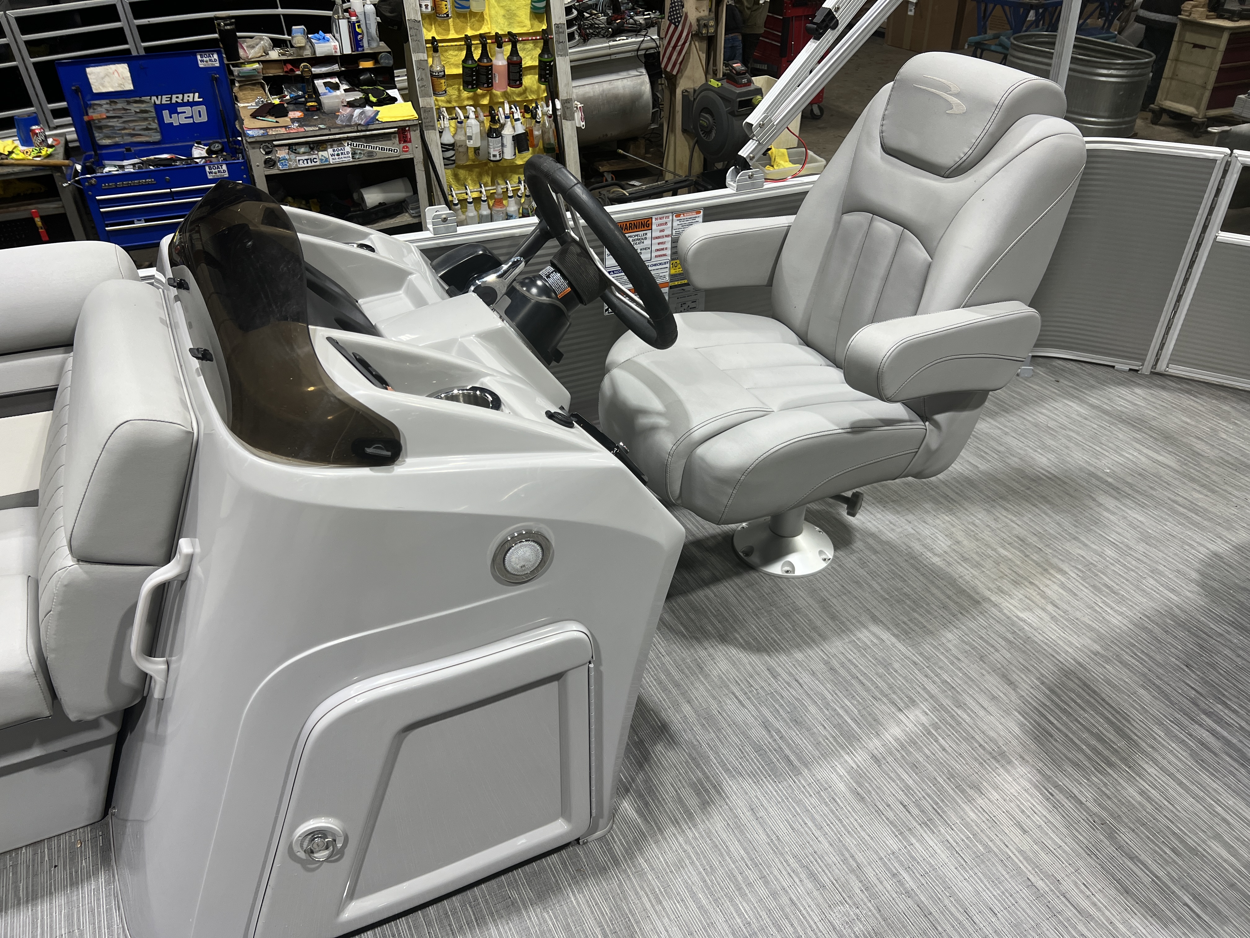 which can be used for storage and the access the helm wiring. The steering wheel