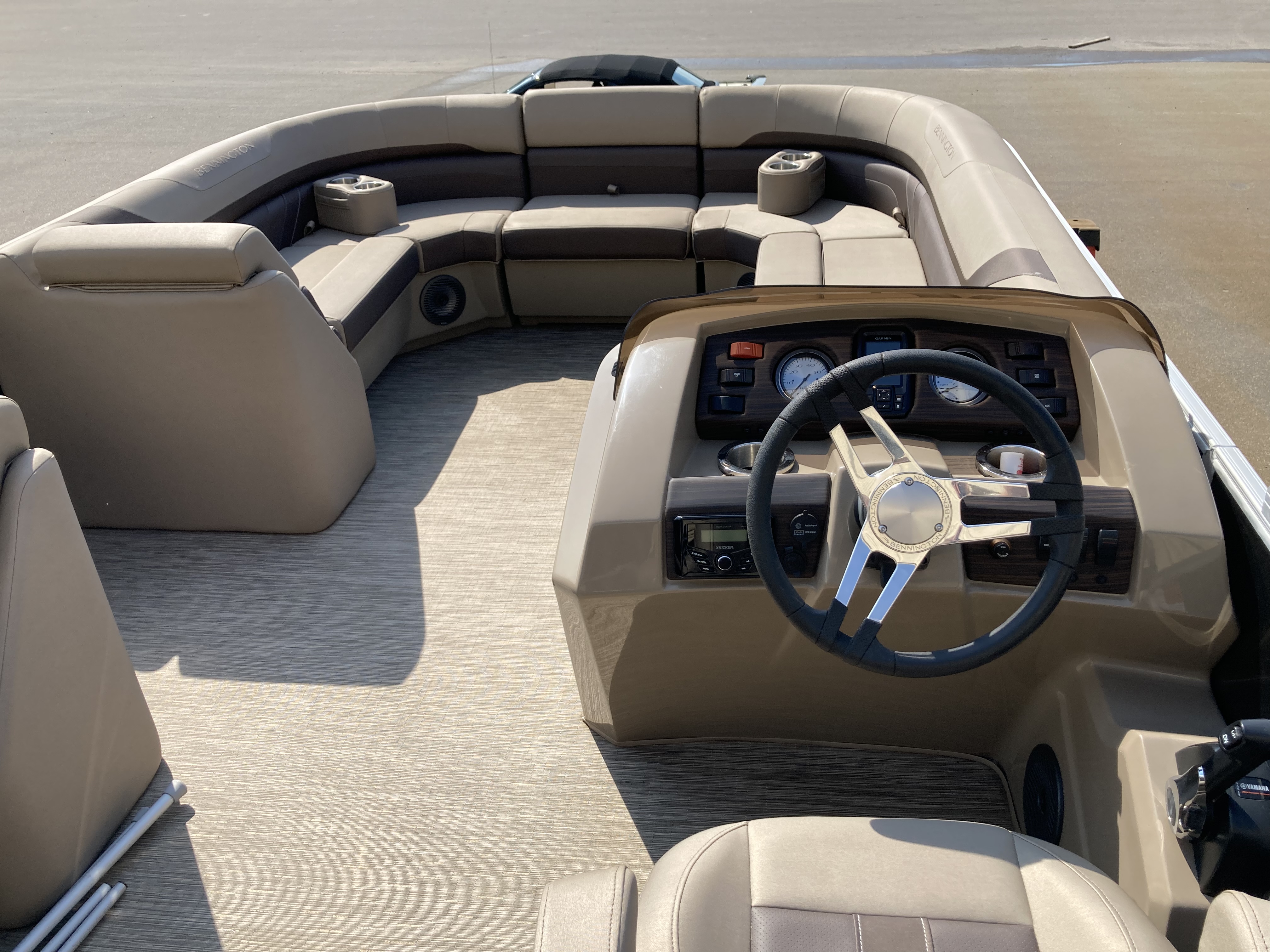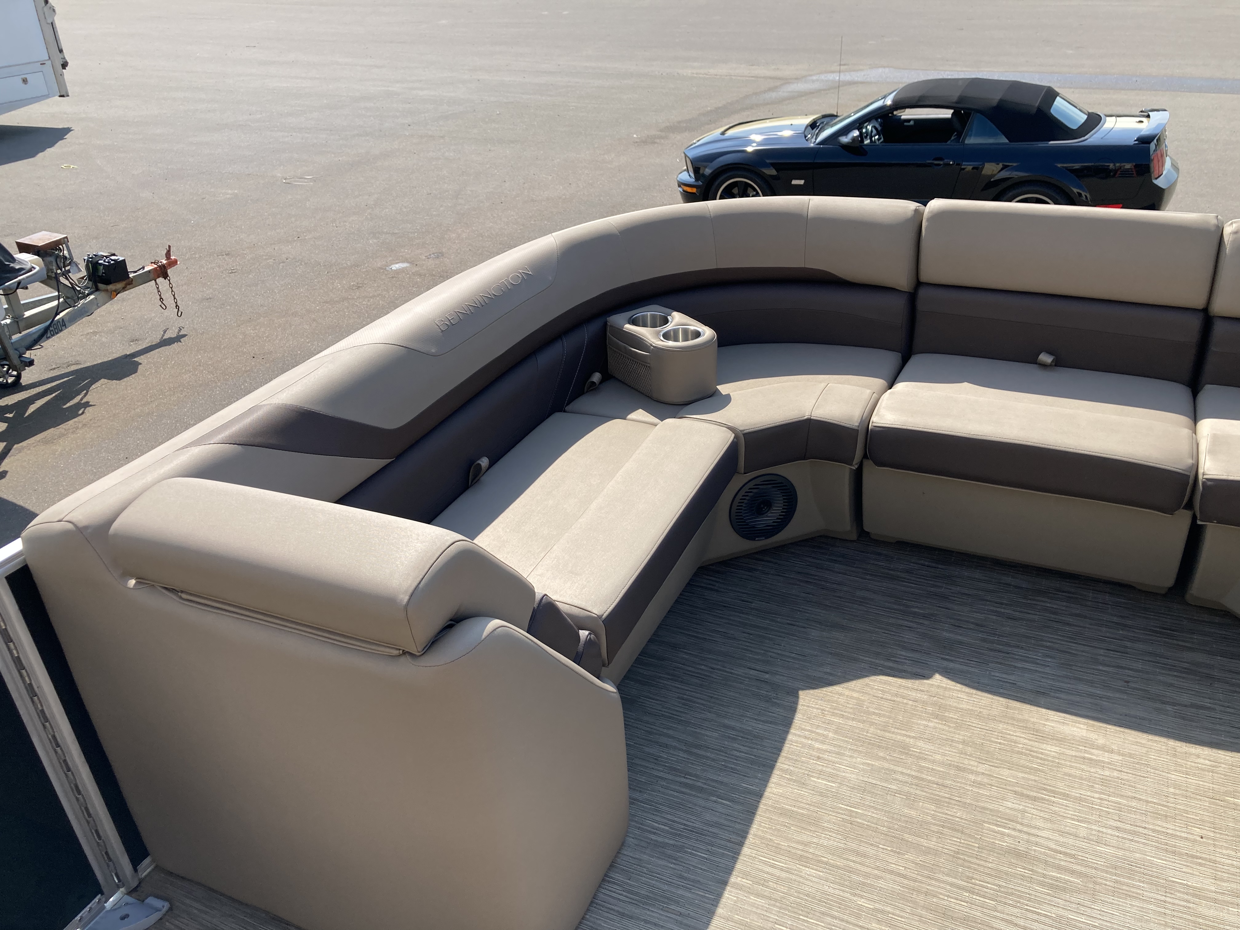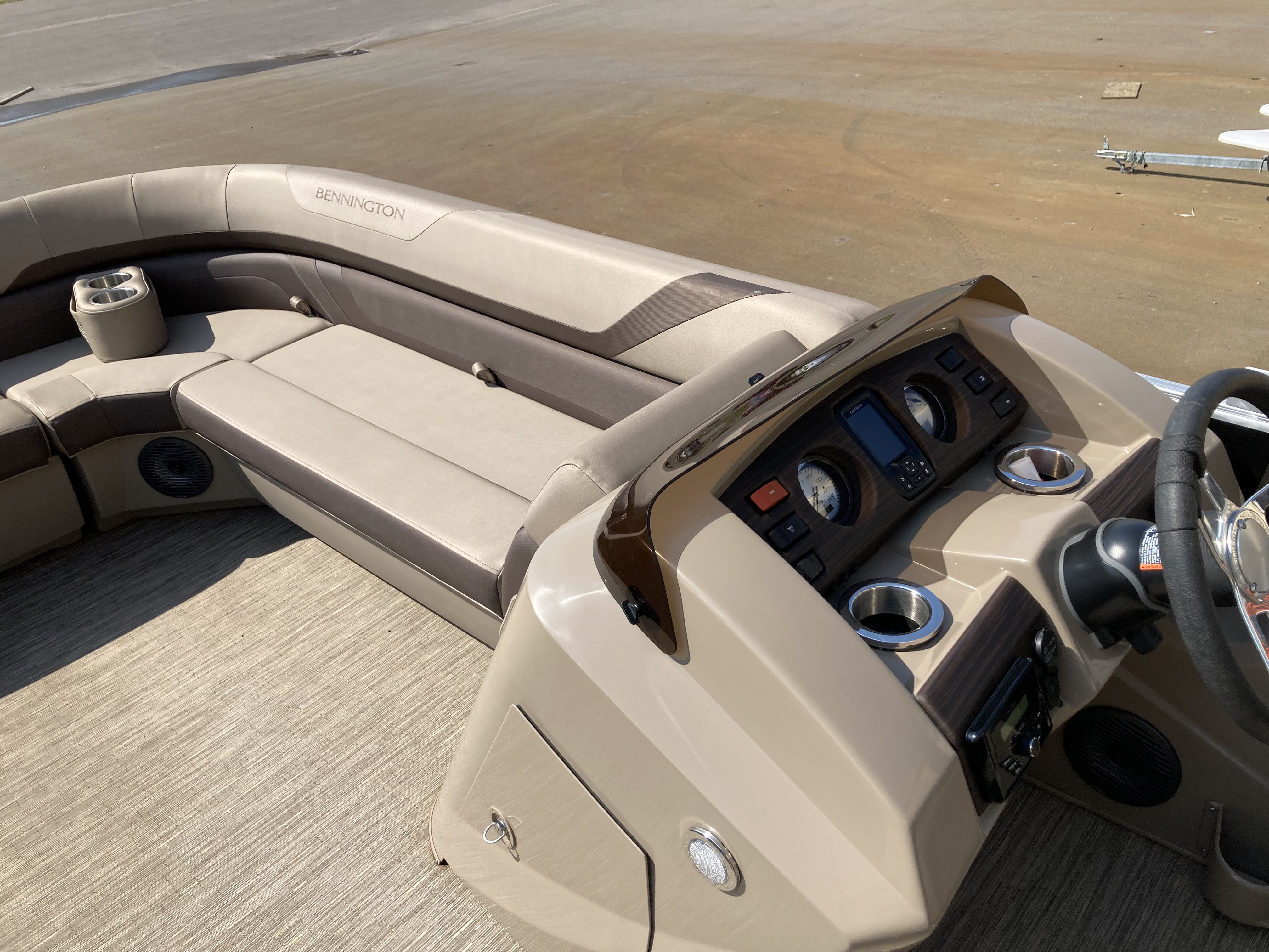 Boat comes with full clip-on mooring cover, bimini top, bluetooth stereo with speakers, full vinyl flooring, Garmin Striker 4 fish finder, RGB Lighting, portable cupholders, bow gate seat for extra seating, docking lights, stainless steel ski tow bar and much more!