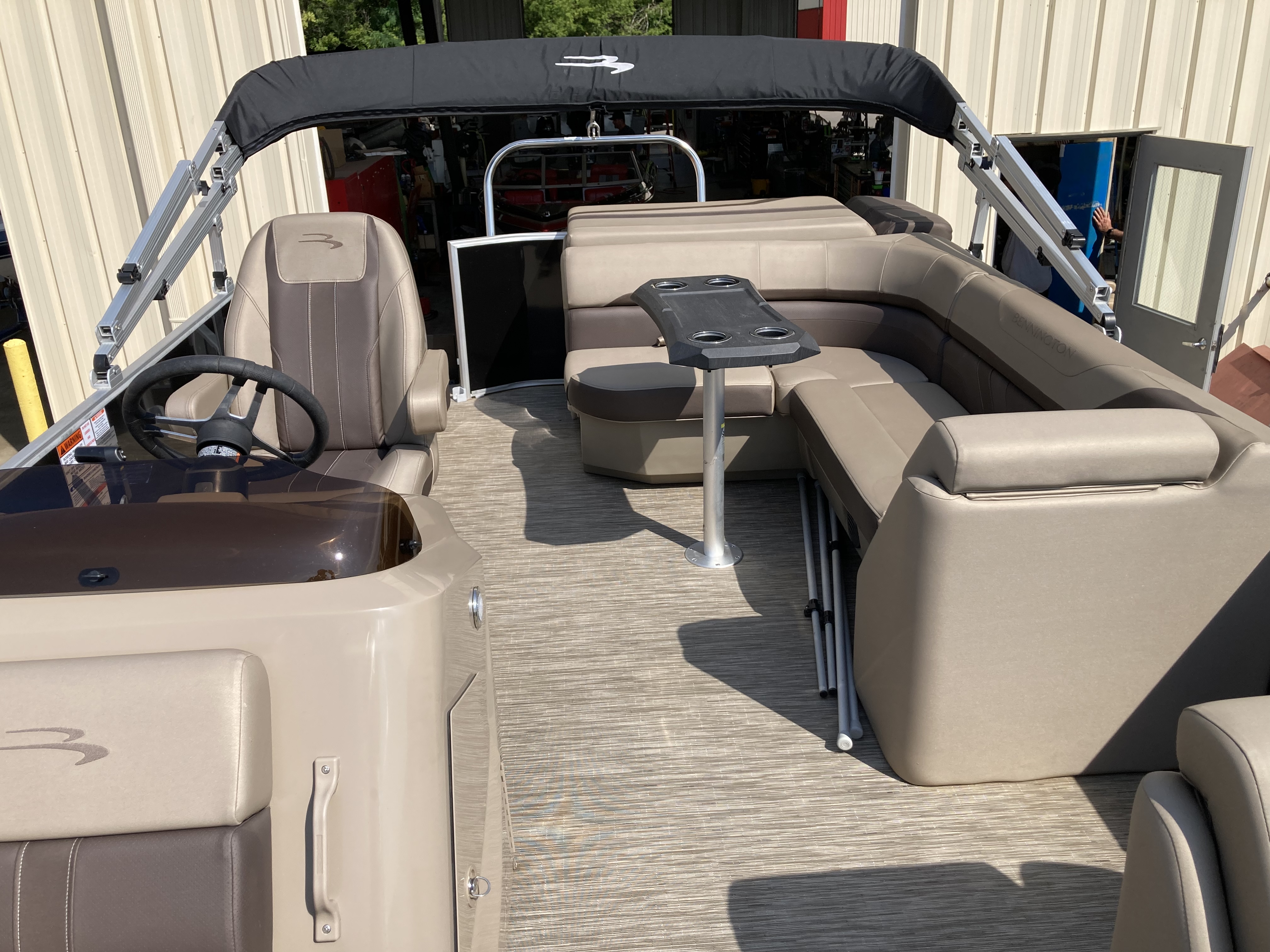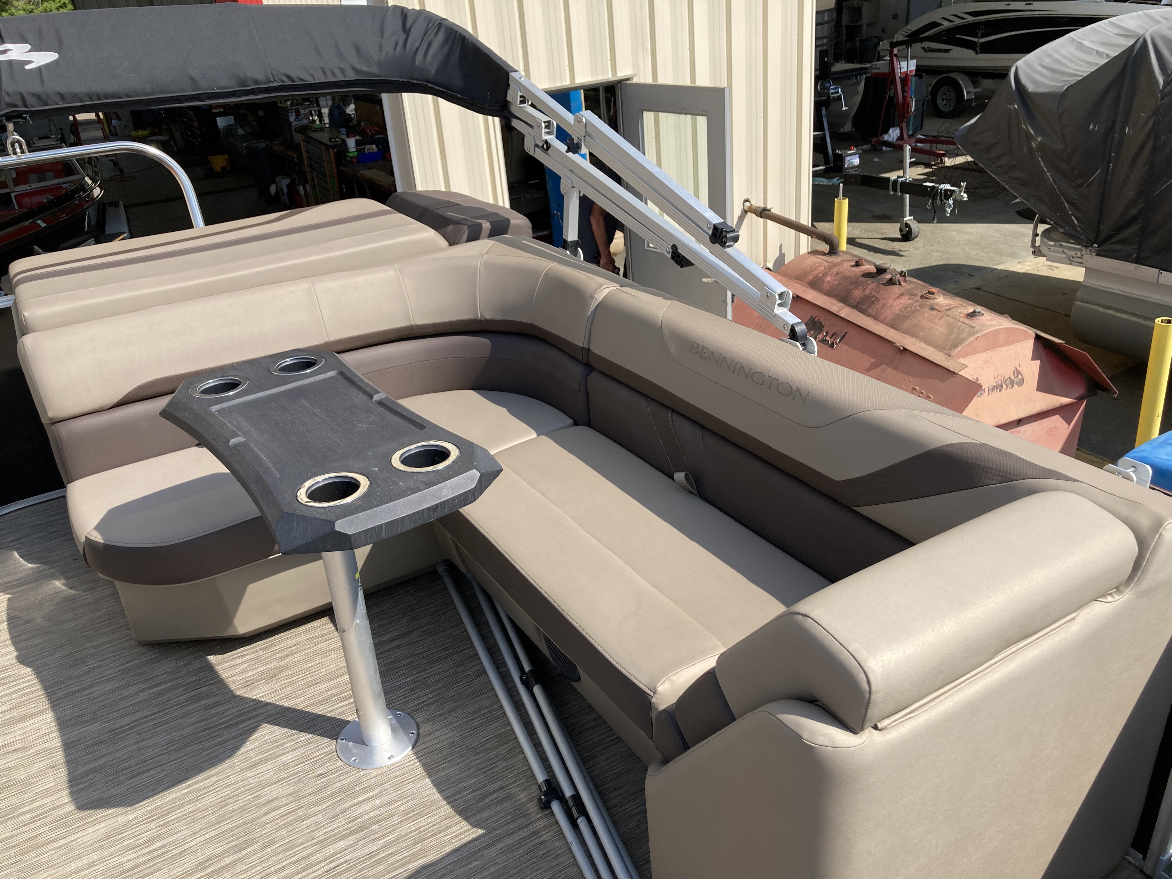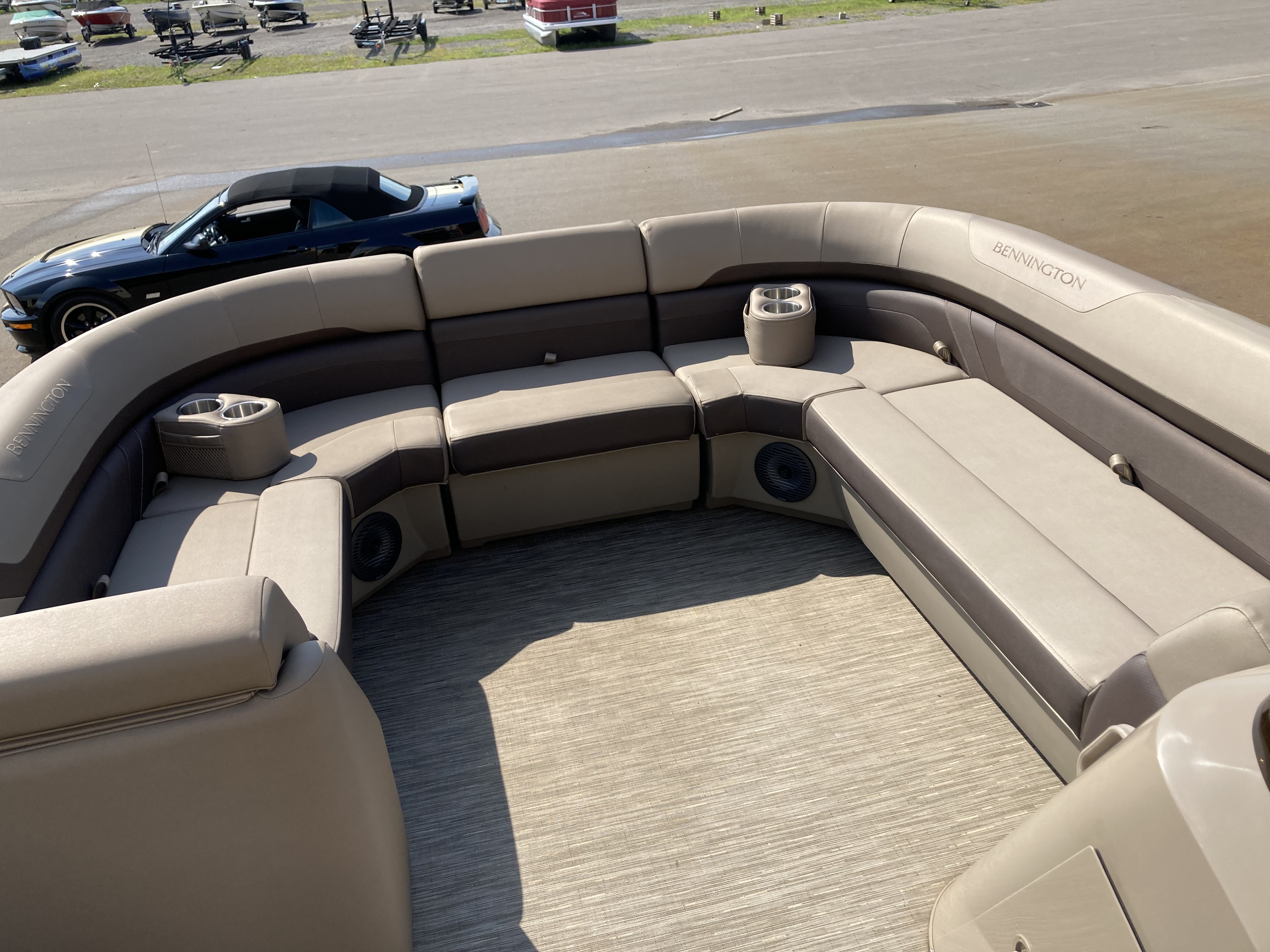 Boat comes with full clip-on mooring cover, bimini top, bluetooth stereo with speakers, full vinyl flooring, Garmin Striker 4 fish finder, RGB Lighting, portable cupholders, bow gate seat for extra seating, docking lights, stainless steel ski tow bar and much more!
