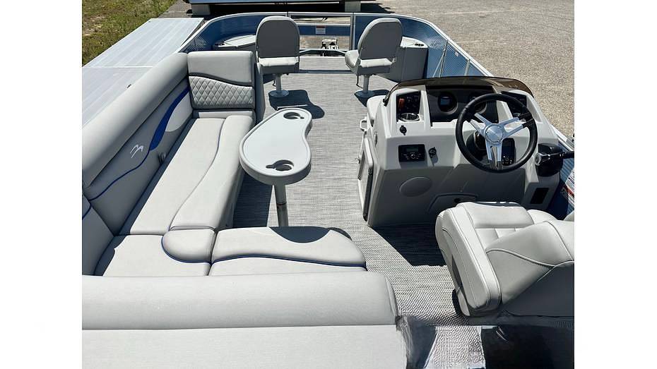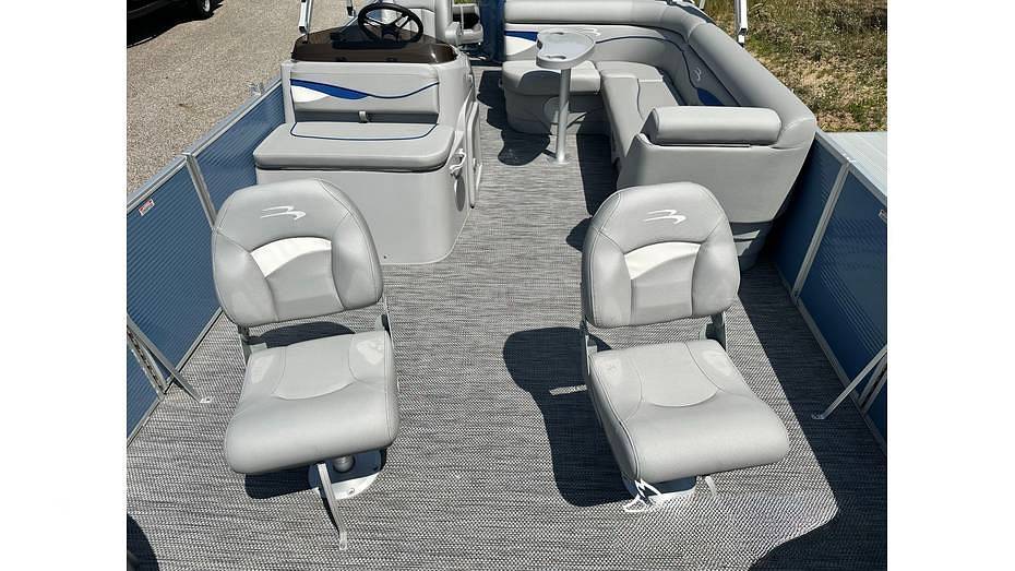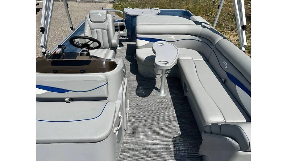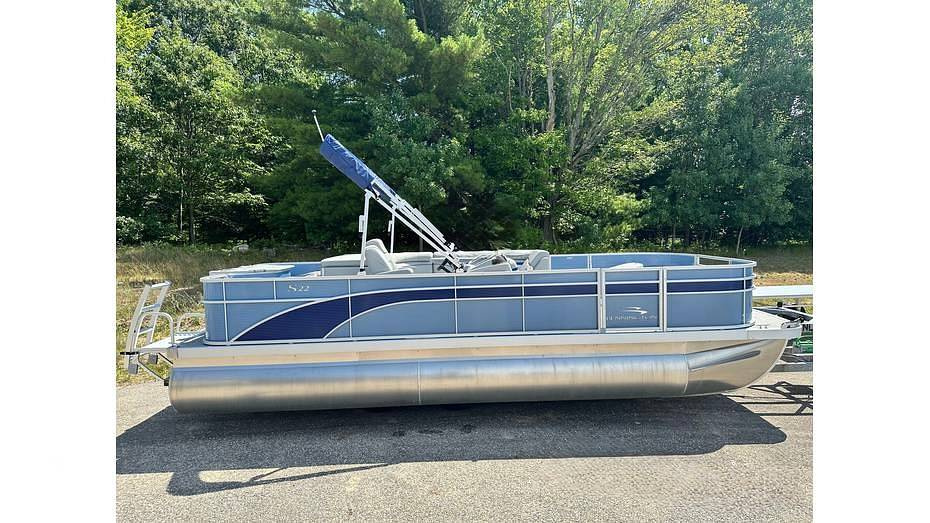 This 22-foot pontoon features a spacious deck with an 8' 6" beam, providing stability and room for multiple activities. The "SF" layout includes four fishing seats and integrated livewells, catering to anglers, while the durable construction and plush seating, often featuring yacht-grade Simtex vinyl upholstery and all-composite seat bases, ensure a comfortable experience for cruising. Standard features typically include a Bimini top and an audio system.
