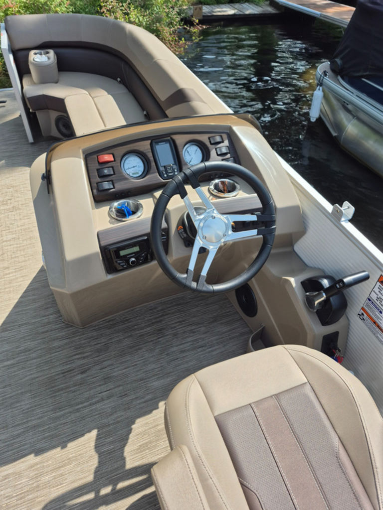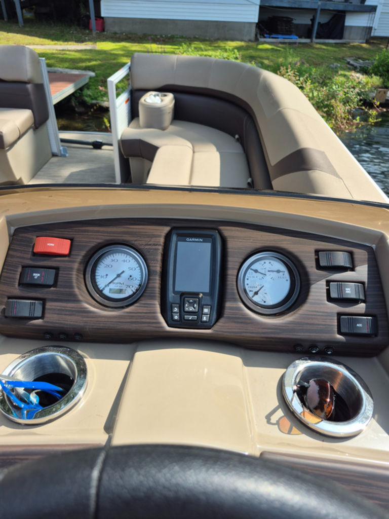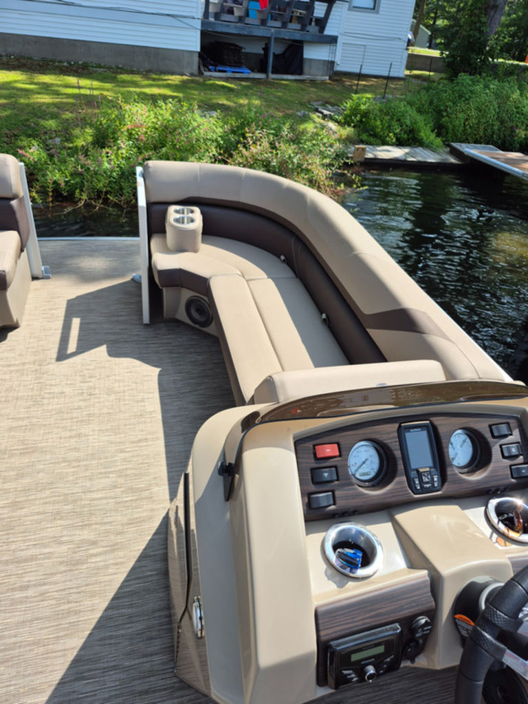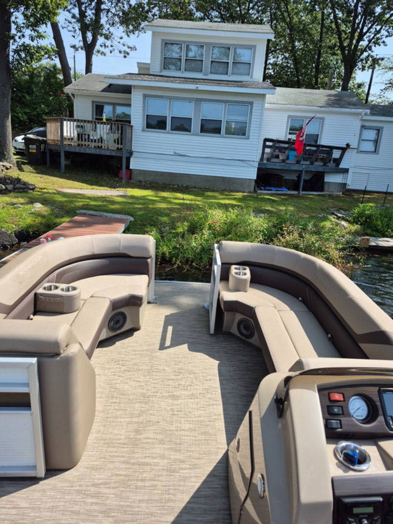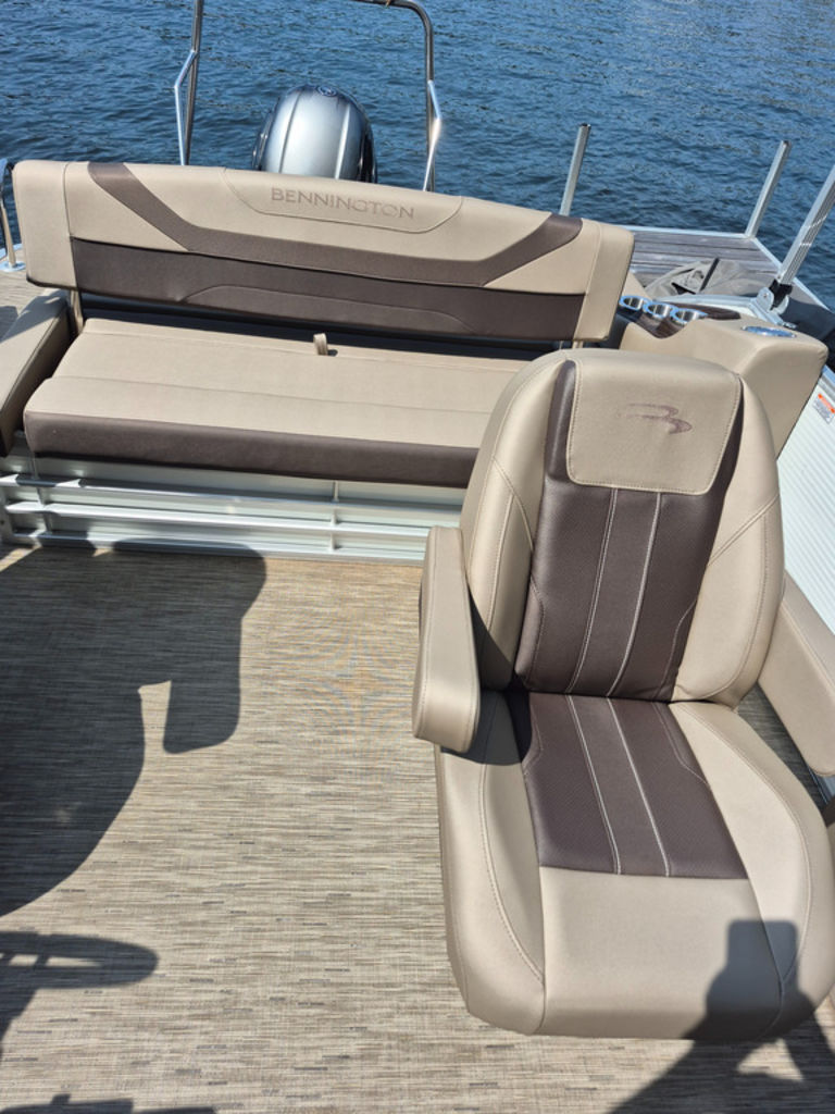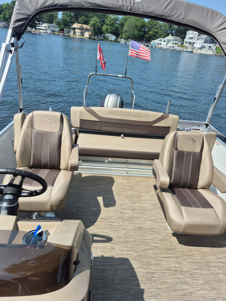 Well cared for Bennington pontoon powered by the Yamaha 115hp V-Max Outboard, configured with the popular Swingback floor plan and captain / co-captain chairs. Features include an extended aft deck to maximize deck space without sacrificing interior seating, upgraded docking lights, portable cup holders, lighted Bimini top and toe-kick lighting.