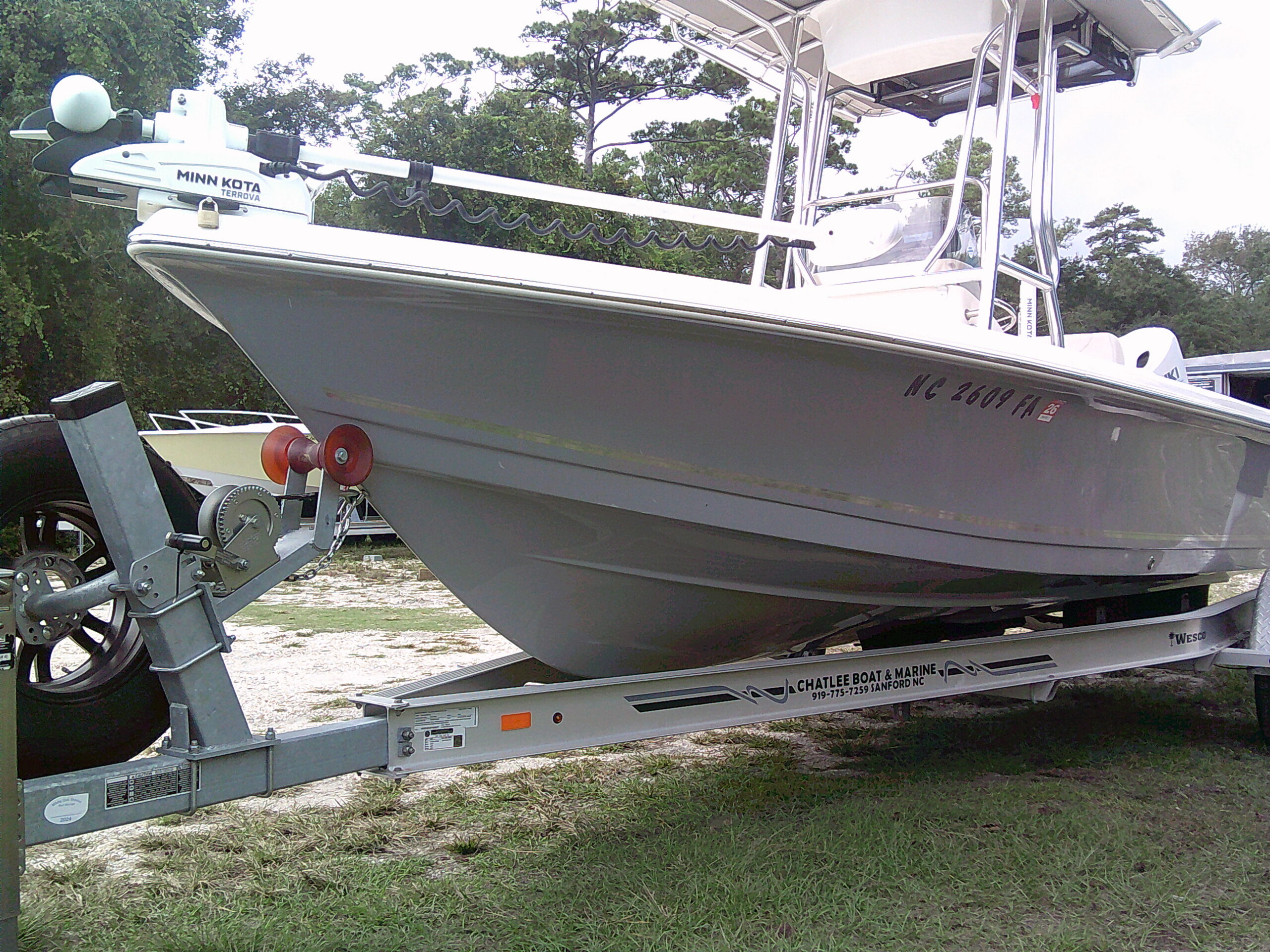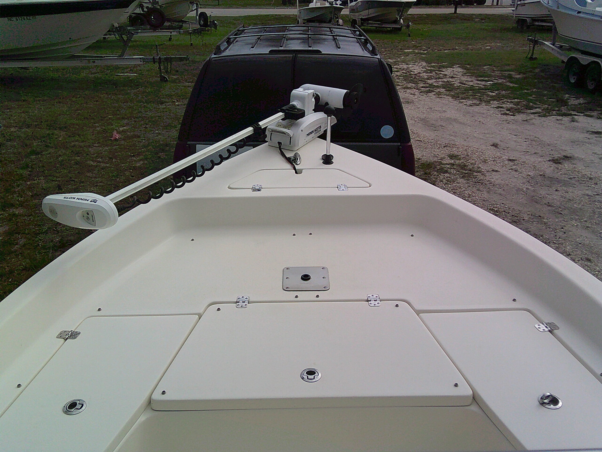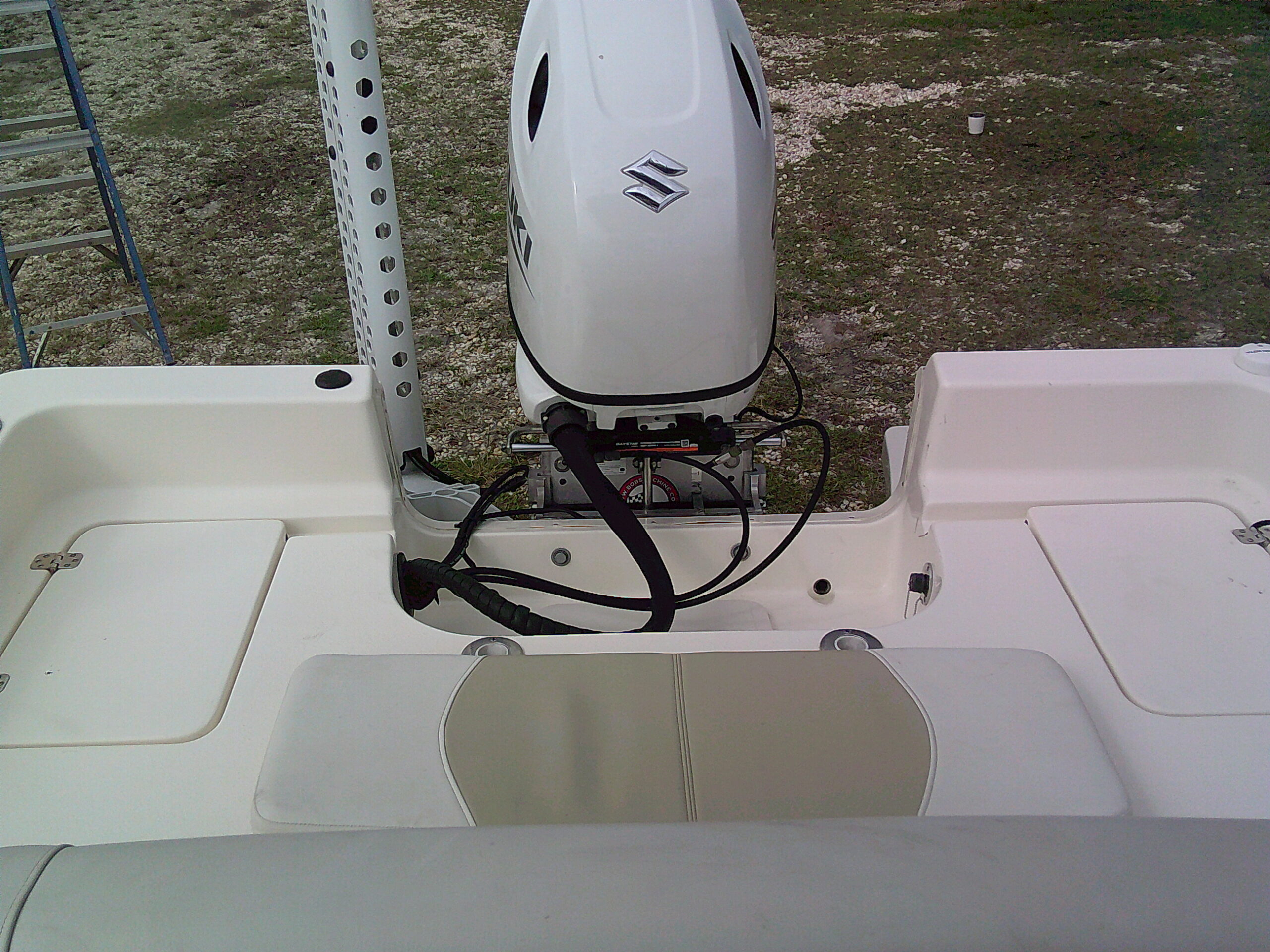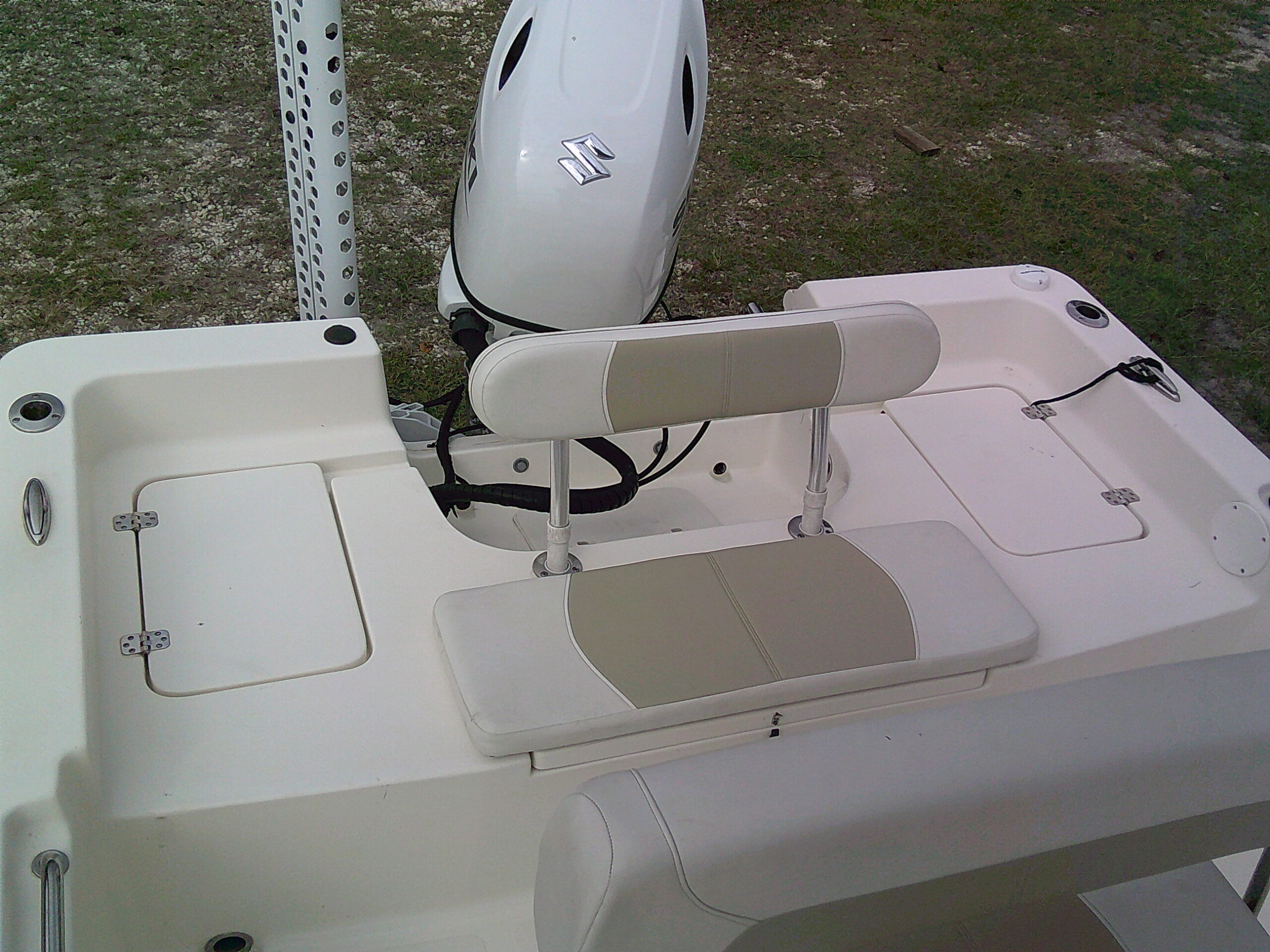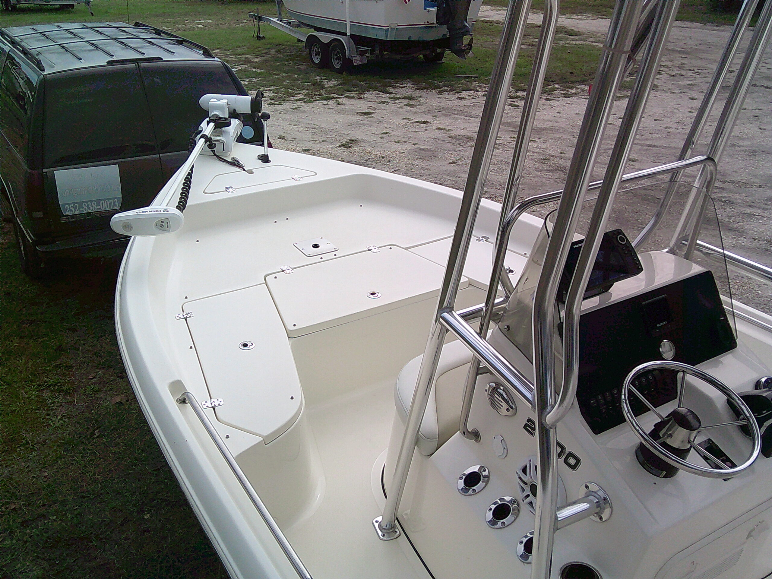 Vessel Info: Large Cushioned Forward Platform, Perfect for Throwing a Cast Net, Fishing or Sunning / Pop Up Cleats / Anchor Locker w/Anchor, Chain, Line / Minn Kota Terrova Trolling Motor, 24 Volt, 80 Lbs. Thrust / 3 Large Storage Boxes / Forward of Console Cushioned Seat/Cooler w/Back Rest / T-Top w/Electrical Box Forward and Aft Spreader Lights / Grab Rails, 6 Rod Holders, T-Bag / Console w/Wind Screen, Grab Rails, Gauges, Controls, Switch Panel, Stainless Steel Helm w/Hydraulic Steering, Storage, 6 Side Rod Holders, 2 Speakers, 2 Cup Holders / Cushioned Helm Bench Seat w/Swing Back Rest, Cooler / Gunnel Grab Rails / 2 Speakers / Large Cushioned Aft Platform w/Storage / Large Live Well / Removable Cushioned Back Rest / 4 Rod Holders / Self Bailing Deck / Minn Kota Raptor Anchor Pole w/Auto Adjust / 2 Batteries w/Switch / Under Water Lights / Jack Plate / Trim Tabs / Swim Platform w/Folding Ladder