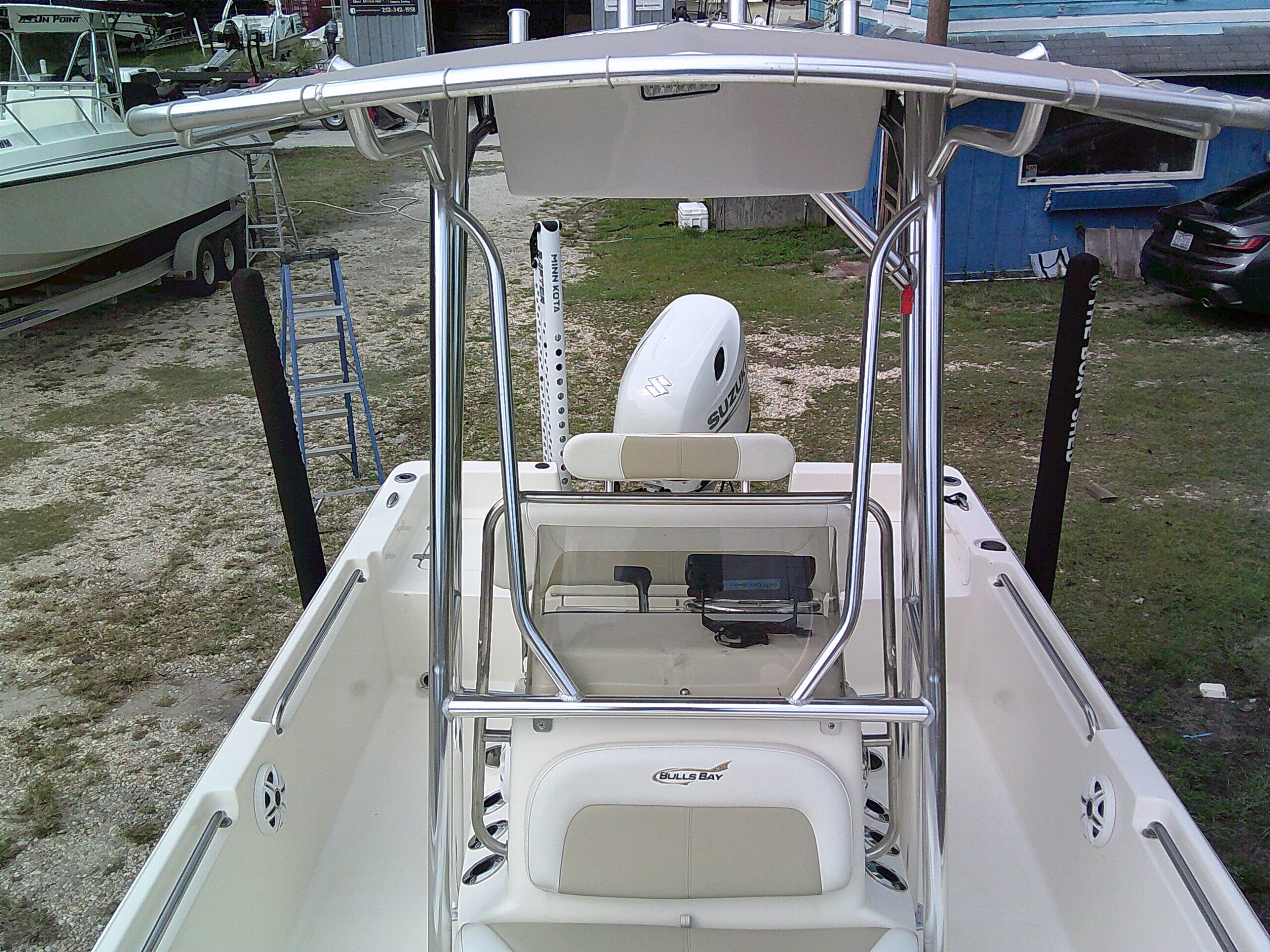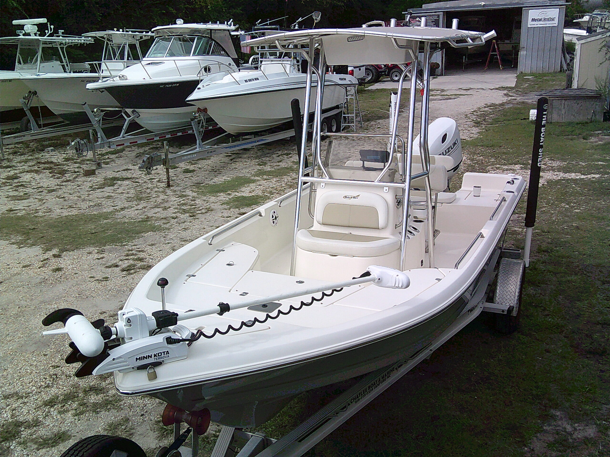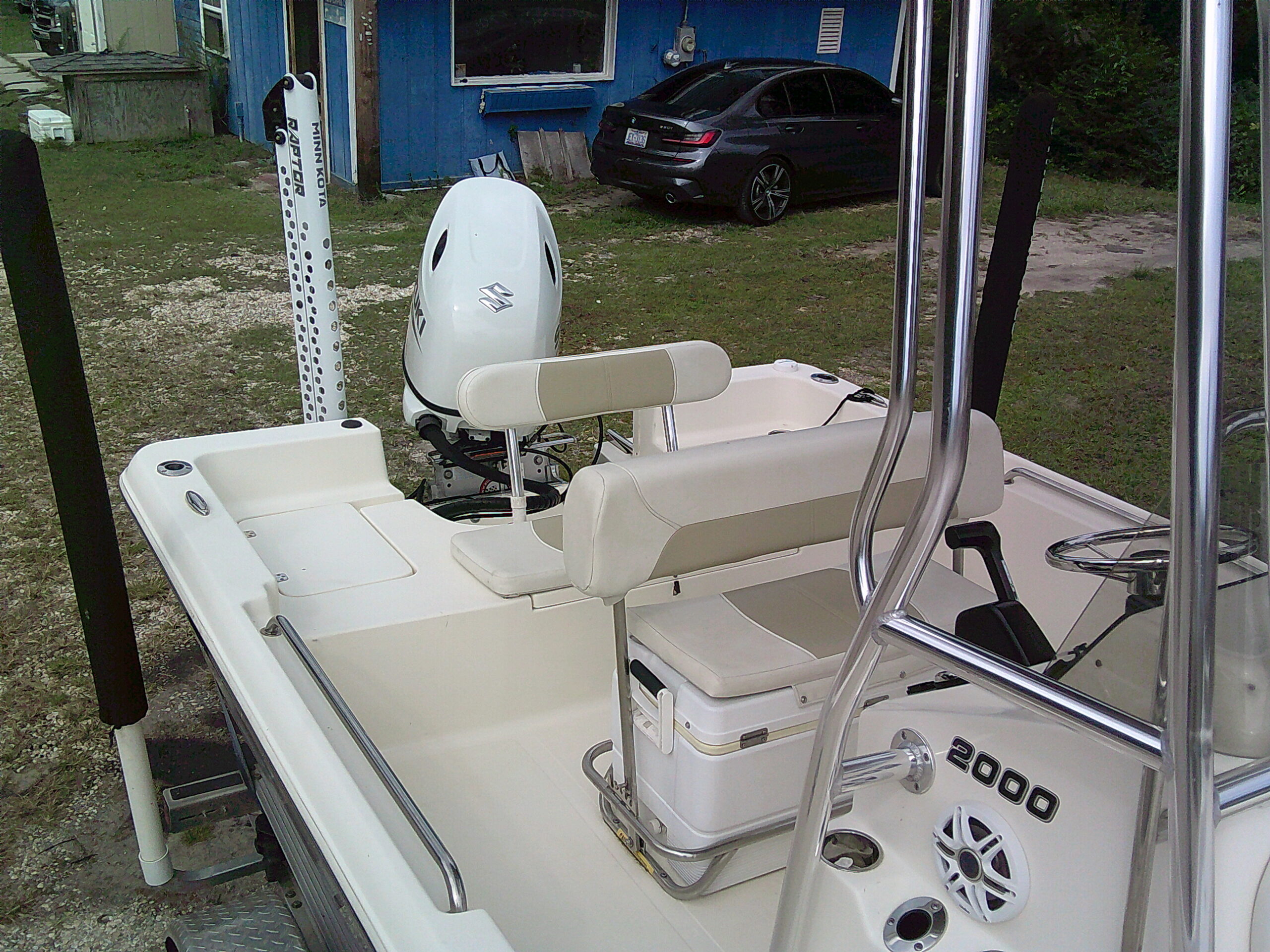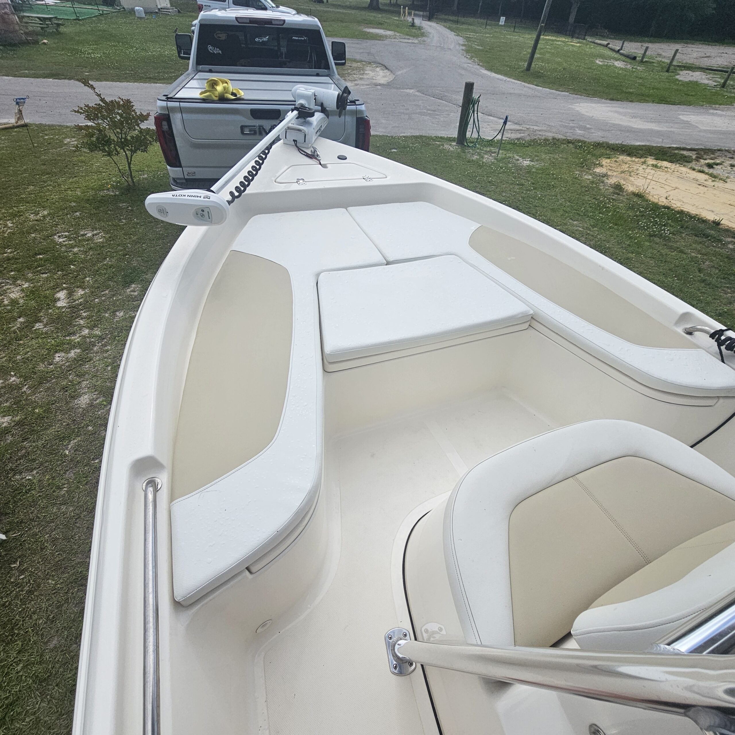Vessel Info: Large Cushioned Forward Platform, Perfect for Throwing a Cast Net, Fishing or Sunning / Pop Up Cleats / Anchor Locker w/Anchor, Chain, Line / Minn Kota Terrova Trolling Motor, 24 Volt, 80 Lbs. Thrust / 3 Large Storage Boxes / Forward of Console Cushioned Seat/Cooler w/Back Rest / T-Top w/Electrical Box Forward and Aft Spreader Lights / Grab Rails, 6 Rod Holders, T-Bag / Console w/Wind Screen, Grab Rails, Gauges, Controls, Switch Panel, Stainless Steel Helm w/Hydraulic Steering, Storage, 6 Side Rod Holders, 2 Speakers, 2 Cup Holders / Cushioned Helm Bench Seat w/Swing Back Rest, Cooler / Gunnel Grab Rails / 2 Speakers / Large Cushioned Aft Platform w/Storage / Large Live Well / Removable Cushioned Back Rest / 4 Rod Holders / Self Bailing Deck / Minn Kota Raptor Anchor Pole w/Auto Adjust / 2 Batteries w/Switch / Under Water Lights / Jack Plate / Trim Tabs / Swim Platform w/Folding Ladder